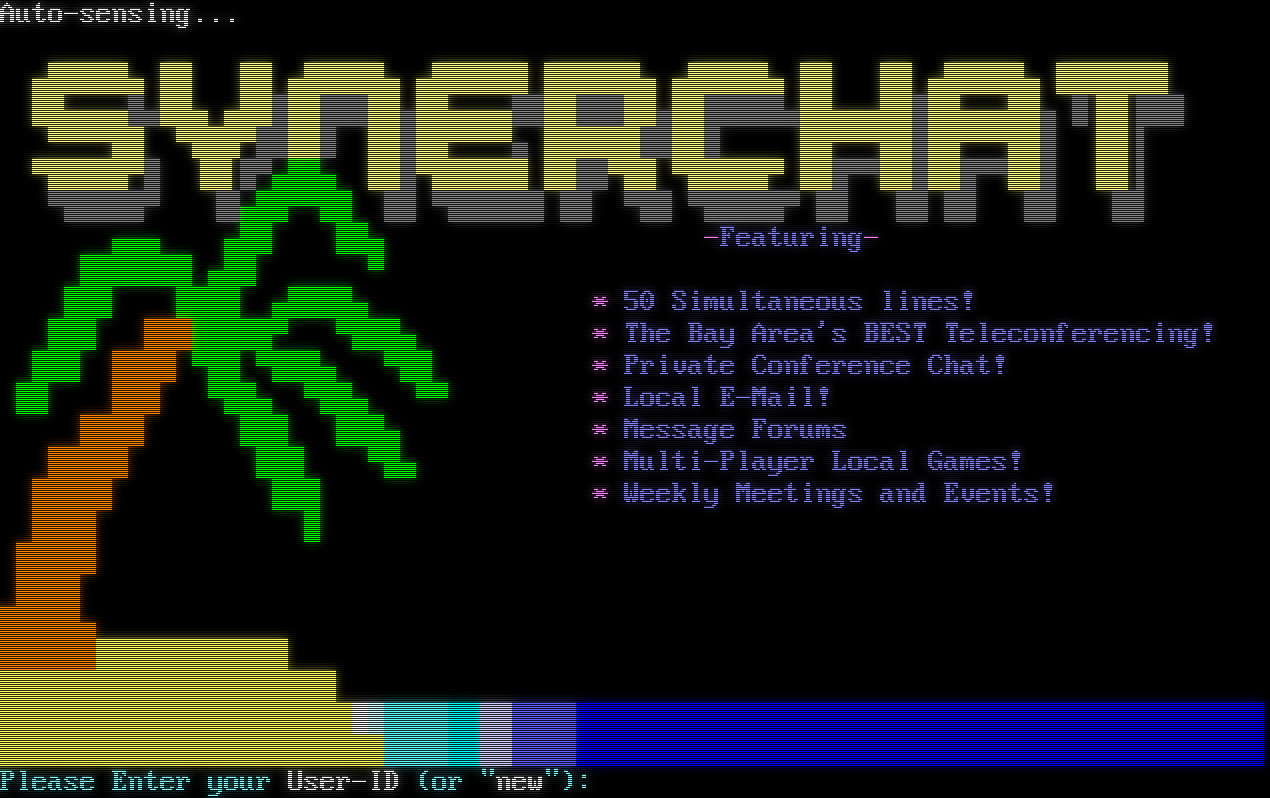 Auto-sensing...  ! ▄█████▄ ██ ██ ▄█████▄ ▄██████ ██████▄ ▄█████▄ ██ ██ ▄█████▄ ███████ ██▄▄▄▄█▄██▄ ▄██████████▄██▄▄▄▄█████████▄███████▄██▄▄▄█████▄▄▄██▄ █▐█▌███ ▀▀▀▀██ ▀███▀█████ █████▀▀▀▀▄ ███████████ ██▀▀▀█████▀▀▀███ ▐█▌▌ ▀█████▀█ ▐█▌█▀▄██▄ ███▀██████ ████▀██ ▀█████▀ ███▀▀██████▀▀███ ▐█▌▌ ▀█████▀ ▐█▄██▀▀██ ██ ▀██████ ██ ▀██ ▀█████▀ ██ ██ ██ ██ ▐█▌ ▄▄▄ ▄██ ██▄ -Featuring- ███████ ▄██ ▀ ███ ████ ▄████▄ \* 50 Simultaneous lines! ███ ████████▀ ▀███▄ \* The Bay Area's BEST Teleconferencing! ███ ████ ▀██ ▀███▄ ▀██ \* Private Conference Chat! ██ ███ ▀██▄ ▀██▄ ▀▀ \* Local E-Mail! ████ ███ ███▄ \* Message Forums █████ ███ ▀█▄ \* Multi-Player Local Games! █████ ███ \* Weekly Meetings and Events! ████ █ █████ ████ █████▄ ██████▓▓▓▓▓▓▓▓▓▓▓▓ ▓▓▓▓▓▓▓▓▓▓▓▓▓▓▓▓▓▓▓▓▓ ▓▓▓▓▓▓▓▓▓▓▓▓▓▓▓▓▓▓▓▓▓▓▓▒░░░░ ▒▒░░░░ ▓▓▓▓▓▓▓▓▓▓▓▓▓▓▓▓▓▓▓▓▓▓▓▓░░░░ ▒▒░░░░ Please Enter your User-ID (or "new"):