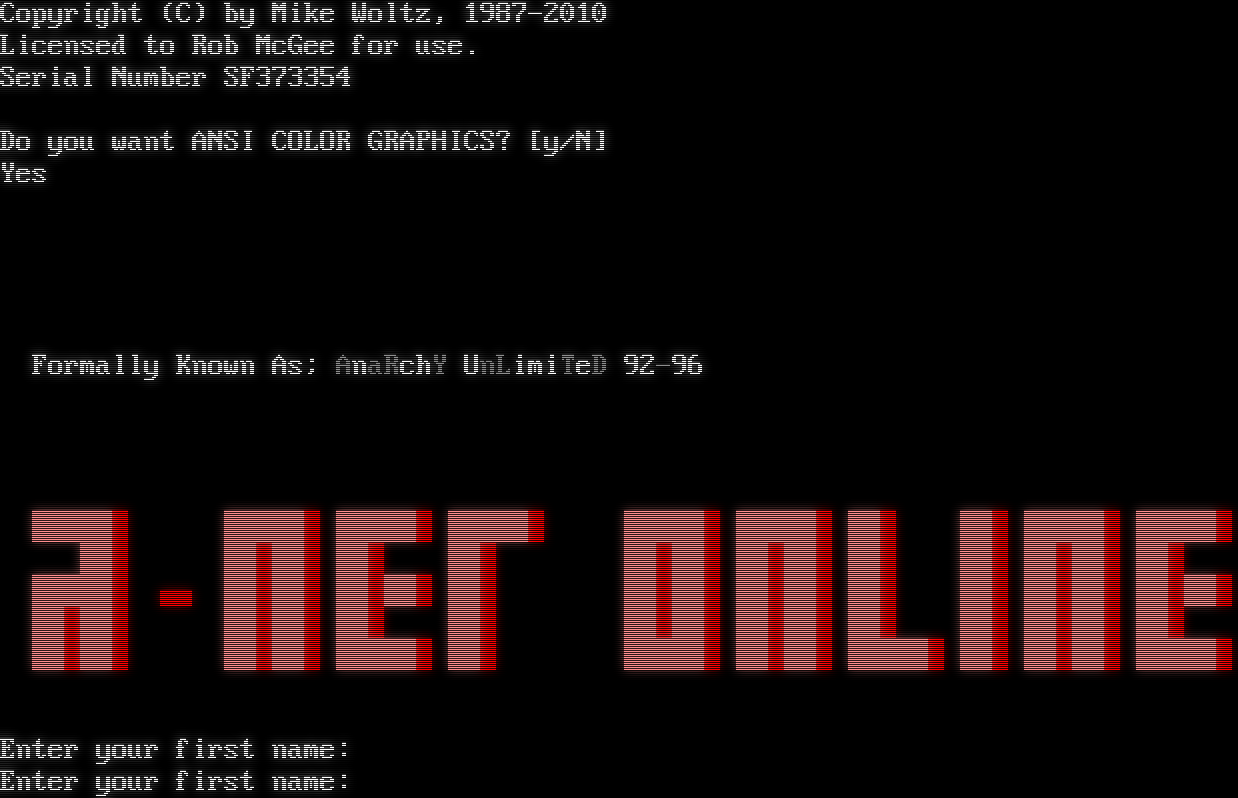 ┌─────────────────┐ ╔═════[ SPITFIRE BBS ]═══════════════════════════════════╡ A-Net Spitfire │ ║ └───────╥─────────┘ ║ For the best experience type [Y]es for color ANSI displays. ║ ║ NEW USERS: Personal Information is NOT required. When asked ║ ║ for First/Last name you can use Alias/Handel if you wish. ║ ║ When asked for phone #, just type zeros :) ║ ║ ║ ╚════════════════════════════════════════════════════════════════╝ Your Sysop is Stingray - Node 1 SPITFIRE Bulletin Board System - Version 3.7 Buffalo Creek Software Copyright (C) by Mike Woltz, 1987-2010 Licensed to Rob McGee for use. Serial Number SF373354 Do you want ANSI COLOR GRAPHICS? [y/N] Yes Formally Known As; AnaRchY UnLimiTeD 92-96 ██████ ██████ ██████ ██████ ██████ ██████ ███ ███ ██████ ██████ ███ ██████ ███ ███ ██████ ██████ ███ ███ ██████ ███ ██████ ▄▄ ██████ ██████ ███ ██████ ██████ ███ ███ ██████ ██████ ██████ ██████ ███ ███ ██████ ██████ ███ ███ ██████ ███ ██████ ██████ ██████ ███ ██████ ██████ ██████ ███ ██████ ██████ Enter your first name: Enter your first name:
