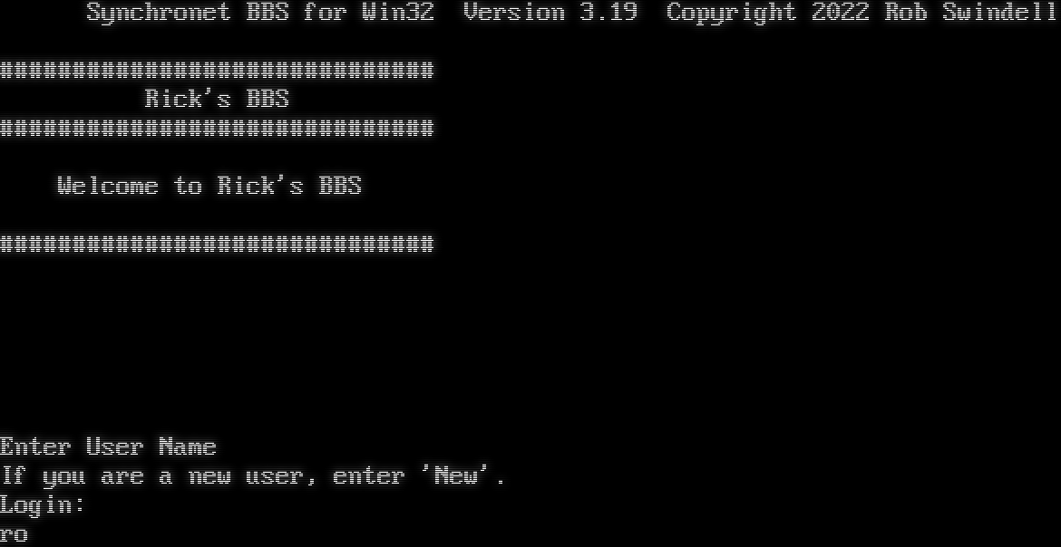 Synchronet BBS for Win32 Version 3.19 Telnet connection from: 64.227.40.173 Resolving hostname... _ ∩╗┐_ Synchronet BBS for Win32 Version 3.19 Copyright 2022 Rob Swindell #​############################# Rick's BBS #​############################# Welcome to Rick's BBS #​############################# Enter User Name If you are a new user, enter 'New'. Login: ro