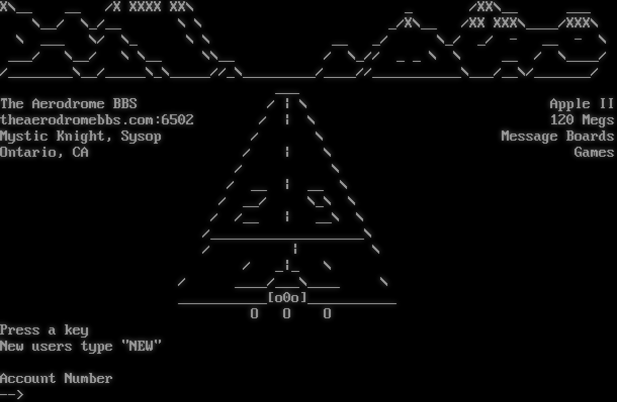 ___ _ _/XXX\\ (_) _ /XXXXXX\\_ __ X\\__ __ /X XXXX XX\\ _ /XX\\__ ___ \\__/ \\_/__ \\ \\ _/X\\__ /XX XXX\\_​___/XXX\\ \\ ___ \\/ \\_ \\ \\ __ _/ \\_/ _/ - __ - \\ ___/ \\__/ \\ \\__ \\\\__ / \\_// _ _ \\ \\ __ / \\_​___/ /_​_______\\__/_​____\\_\\_​____//_\\_​________/_​___//_​__________\\___/__\\/_​______/ ___ The Aerodrome BBS / \| \\ Apple II theaerodromebbs.com:6502 / \| \\ 120 Megs Mystic Knight, Sysop / \\ Message Boards Ontario, CA / \| \\ Games / \\ / __ \| __ \\ / __/ \\_\\ \\ / /__ \| __\\ \\ /_​__________________\\ / \| \\ / _\|_ \\ / _​___/___\\_​___ \\ _​__________[o0o]_​__________ O O O Press a key New users type "NEW" Account Number -->