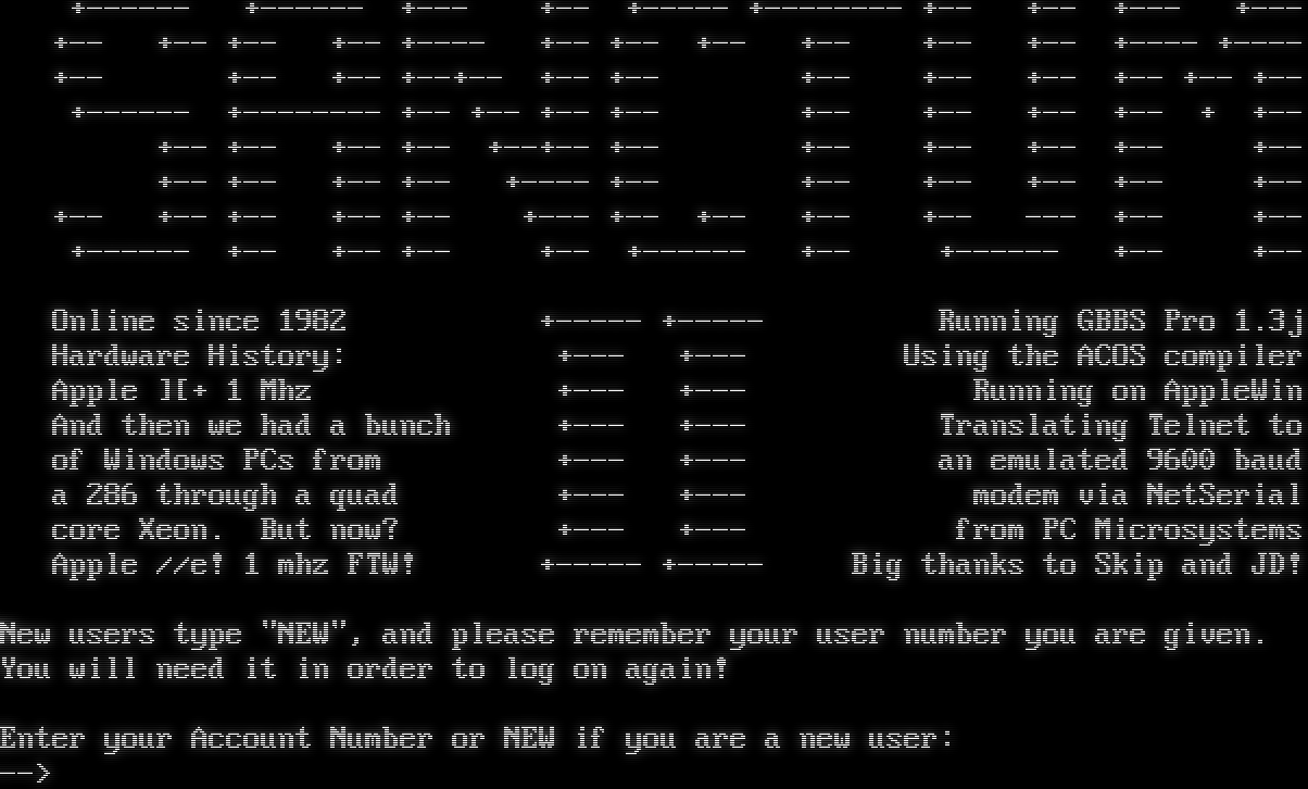 Connect at [2400] baud! +​------ +​------ +​--- +-- +​----- +​-------- +-- +-- +​--- +​--- +-- +-- +-- +-- +​---- +-- +-- +-- +-- +-- +-- +​---- +​---- +-- +-- +-- +​--+-- +-- +-- +-- +-- +-- +-- +-- +-- +​------ +​-------- +-- +-- +-- +-- +-- +-- +-- +-- + +-- +-- +-- +-- +-- +​--+-- +-- +-- +-- +-- +-- +-- +-- +-- +-- +-- +​---- +-- +-- +-- +-- +-- +-- +-- +-- +-- +-- +-- +​--- +-- +-- +-- +-- --- +-- +-- +​------ +-- +-- +-- +-- +​------ +-- +​------ +-- +-- Online since 1982 +​----- +​----- Running GBBS Pro 1.3j Hardware History: +​--- +​--- Using the ACOS compiler Apple ][+ 1 Mhz +​--- +​--- Running on AppleWin And then we had a bunch +​--- +​--- Translating Telnet to of Windows PCs from +​--- +​--- an emulated 9600 baud a 286 through a quad +​--- +​--- modem via NetSerial core Xeon. But now? +​--- +​--- from PC Microsystems Apple //e! 1 mhz FTW! +​----- +​----- Big thanks to Skip and JD! New users type "NEW", and please remember your user number you are given. You will need it in order to log on again! Enter your Account Number or NEW if you are a new user: -->