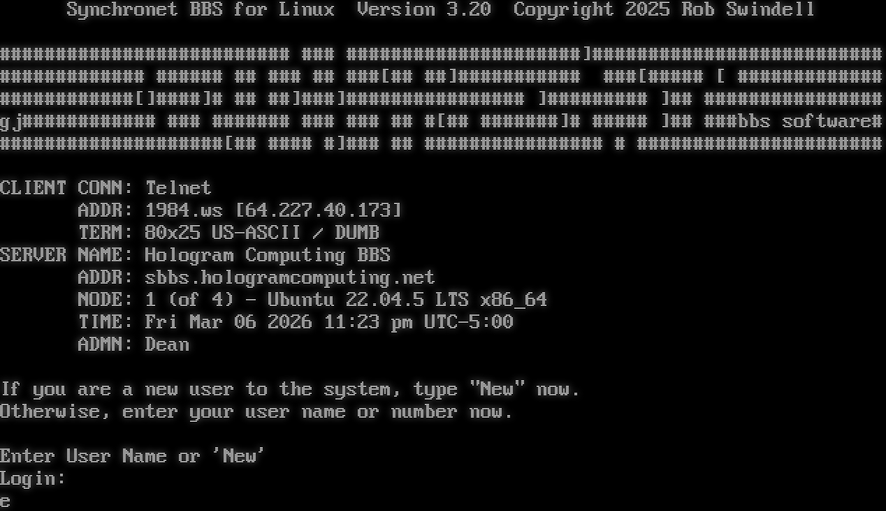 Synchronet BBS for Linux Version 3.20 Telnet connection from: 64.227.40.173 Resolving hostname... _ _ Synchronet BBS for Linux Version 3.20 Copyright 2025 Rob Swindell #​######################### ### #​####################]#​######################### #​############ #​##### ## ### ## ###[## ##]#​########## ###[#​#### [ #​############ #​###########[]#​###]# ## ##]###]#​############### ]#​######## ]## #​############### gj#​########### ### #​###### ### ### ## #[## #​######]# #​#### ]## ###bbs software# #​###################[## #​### #]### ## #​############### # #​##################### CLIENT CONN: Telnet ADDR: 1984.ws [64.227.40.173] TERM: 80x25 US-ASCII / DUMB SERVER NAME: Hologram Computing BBS ADDR: sbbs.hologramcomputing.net NODE: 1 (of 4) - Ubuntu 22.04.5 LTS x86_64 TIME: Fri Mar 06 2026 11:23 pm UTC-5:00 ADMN: Dean If you are a new user to the system, type "New" now. Otherwise, enter your user name or number now. NN: Enter User Name or 'New' Login: Bee