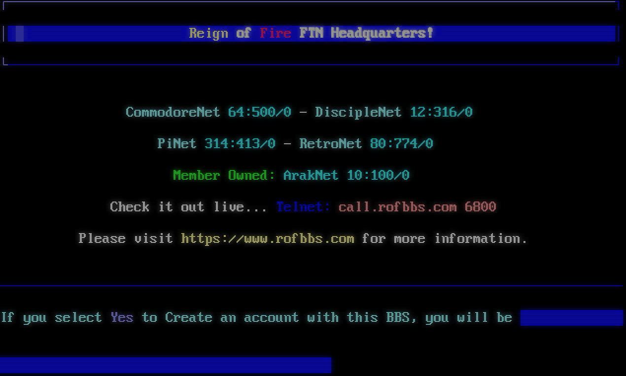 Mystic BBS Version 1.12 A49 Copyright (C) 1997-2024 By James Coyle Detecting terminal emulation: ANSI detected. ╔══════════════════════════════════════════════════════════════════════════╗ ║ ROF FTN WORLD HEADQUARTERS ║ ║ ║ ║ ████ ROFBBS.COM ████ ║ ║ ║ ╠══════════════════════════════════════════════════════════════════════════╣ ║ ArakNet CommodoreNet DiscipleNet ║ ║ PiNet RetroNet ║ ║ ║ ║ Telnet : call.rofbbs.com ║ ║ Ports : 6800 6400 8502 ║ ║ C= Amiga 64-DS2 C128 BBS ║ ║ ║ ╠══════════════════════════════════════════════════════════════════════════╣ ║ This Is NOT A Traditional BBS System ║ ║ Admin Access Required ║ ╚══════════════════════════════════════════════════════════════════════════╝ [■] Enter your user name: ┌─────────────────────────────────────────────────────────────────────────────┐ │ ▒ Reign of Fire FTN Headquarters! │ └─────────────────────────────────────────────────────────────────────────────┘ CommodoreNet 64:500/0 - DiscipleNet 12:316/0 PiNet 314:413/0 - RetroNet 80:774/0 Member Owned: ArakNet 10:100/0 Check it out live... Telnet: call.rofbbs.com 6800 Please visit https://www.rofbbs.com for more information. ─────────────────────────────────────────────────────────────────────────────── If you select Yes to Create an account with this BBS, you will be DISCONNECTED! Create an account with this BBS? Yes No
