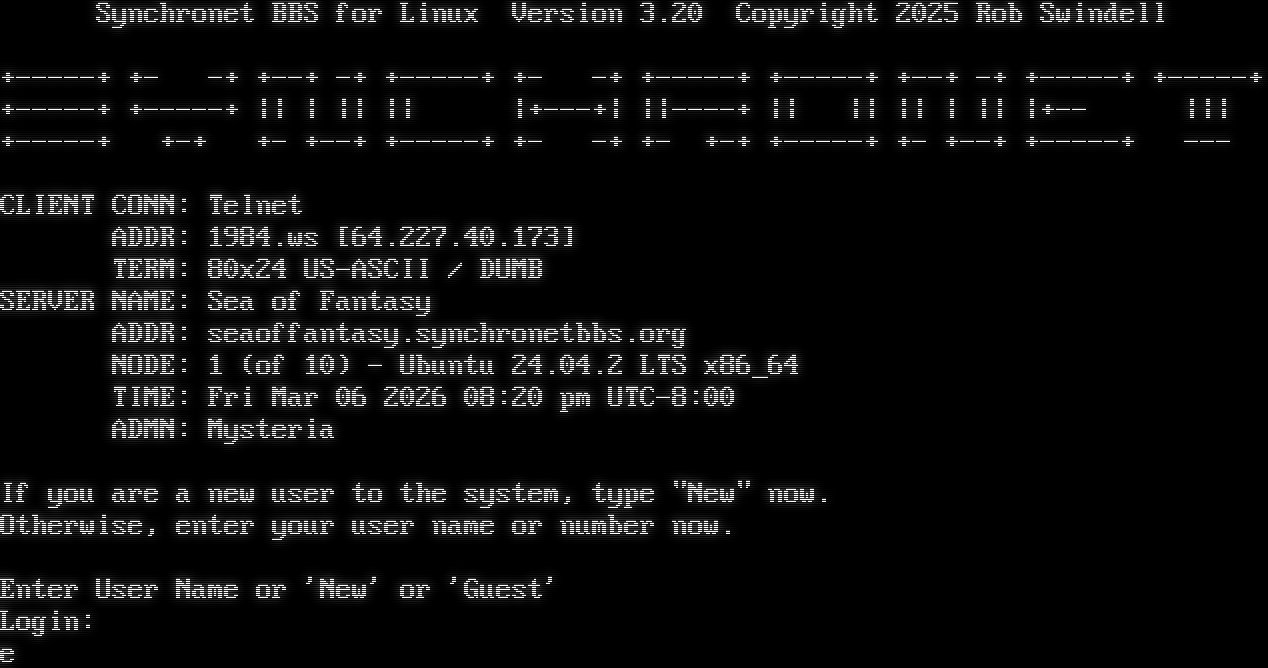 Synchronet BBS for Linux Version 3.20 Telnet connection from: 64.227.40.173 Resolving hostname... _ _ Synchronet BBS for Linux Version 3.20 Copyright 2025 Rob Swindell +​-----+ +- -+ +​--+ -+ +​-----+ +- -+ +​-----+ +​-----+ +​--+ -+ +​-----+ +​-----+ +​-----+ +​-----+ \|\| \| \|\| \|\| \|+​---+\| \|\|-​---+ \|\| \|\| \|\| \| \|\| \|+-- \|\|\| +​-----+ +-+ +- +​--+ +​-----+ +- -+ +- +-+ +​-----+ +- +​--+ +​-----+ --- CLIENT CONN: Telnet ADDR: 1984.ws [64.227.40.173] TERM: 80x24 US-ASCII / DUMB SERVER NAME: Sea of Fantasy ADDR: seaoffantasy.synchronetbbs.org NODE: 1 (of 10) - Ubuntu 24.04.2 LTS x86_64 TIME: Fri Mar 06 2026 08:20 pm UTC-8:00 ADMN: Mysteria If you are a new user to the system, type "New" now. Otherwise, enter your user name or number now. NN: Enter User Name or 'New' or 'Guest' Login: Bee