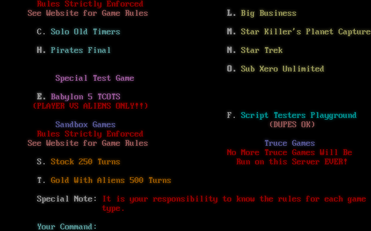 Telnet connection detected. Please enter your name (ENTER for none): TradeWars Game Server Copyright (C) EIS TWGS v2.20b www.eisonline.com Server registered to Star Killer's TWGS Supports up to 25 games and 100 nodes Welcome To.​... Star Killer's ┌─────┐ ┌─────┐ ┌─────┐ ┌─────┐ └─┐ ┌─┘ │ ┌─┐ │ │ ┌───┘ │ ┌─┐ │ │ │ │ │ └─┘ │ └──┐ │ └─┘ │ │ │ │ │ ┌─┐ │ ┌──┘ └───┐ │ ┌─┘ └─┐ │ └─┘ │ │ └───┐ ┌──┘ │ └─────┘ └─────┘ └─────┘ └────┘ Website: sk-twgs.com Trade Wars Game Server Discord: A Proud V2 Server https://discord.gg/XSrrDyzajb Game Info: "!" Builders Games Unregulated Games Rules Strictly Enforced No Rules Kill 'em All See Website for Game Rules A. Ice9 Pirates BuildersD. Star Killer's Crazy Aliens B. Babylon 5 Builders Unlimited I. Solo Wars P. Toyman's Builders UnlimitedG. Call To Battle U. Ice9 Original Builders J. Sub Zero Regulated GamesK. Stock Rules Strictly Enforced See Website for Game RulesL. Big Business C. Solo Old TimersM. Star Killer's Planet Capture H. Pirates FinalN. Star Trek O. Sub Xero Unlimited Special Test Game E. Babylon 5 TCOTS (PLAYER VS ALIENS ONLY!!) F. Script Testers Playground Sandbox Games(DUPES OK) Rules Strictly Enforced See Website for Game RulesTruce Games No More Truce Games Will Be S. Stock 250 Turns Run on this Server EVER! T. Gold With Aliens 500 Turns Special Note: It is your responsibility to know the rules for each game type. Your Command: