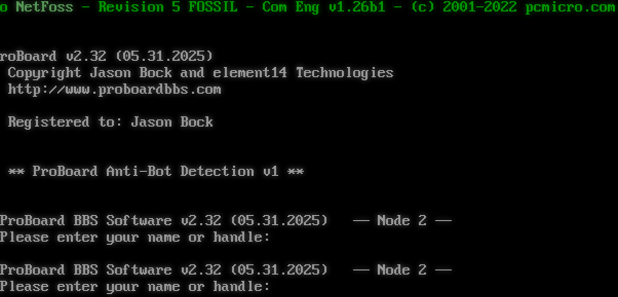 o NetFoss - Revision 5 FOSSIL - Com Eng v1.26b1 - (c) 2001-2022 pcmicro.com ! ProBoard v2.32 (05.31.2025) Copyright Jason Bock and element14 Technologies http://www.proboardbbs.com Registered to: Jason Bock \*\* ProBoard Anti-Bot Detection v1 \*\* Please press [ESC] to continue. ProBoard BBS Software v2.32 (05.31.2025) ── Node 2 ── Please enter your name or handle: ProBoard BBS Software v2.32 (05.31.2025) ── Node 2 ── Please enter your name or handle: