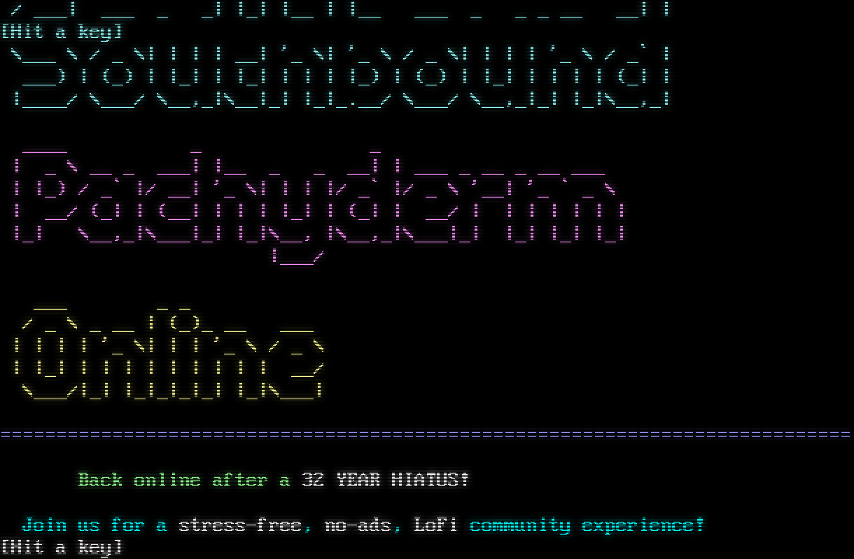 Synchronet BBS for Linux Version 3.21 Telnet connection from: 64.227.40.173 Resolving hostname... _ ∩╗┐ Synchronet BBS for Linux Version 3.21 Copyright 2026 Rob Swindell .​---. / o \\ \| @ @ \| \\ \\_/ / _​___ _​___ ___ _​___ _​___ _​___ /\| \|\\ / ___\|\| _ \\ / _ \\\| __ ) __ ) ___\| / \| _ \| \\ \\___ \\\| \|_) \| \| \| \| _ \\ _ \\___ \\ ( \| \|_\| \| ) ___) \| __/\| \|_\| \| \|_) \| \|_) \|__) \| \\_\|_​____\|_/ \|_​___/\|_\| \\___/\|_​___/_​___/_​___/ \|\| \|\| \|\| \|\| /__\\ /__\\ =​=========================================================================== _​___ _ _ _ _ / ___\| ___ _ _\| \|_\| \|__ \| \|__ ___ _ _ _ __ __\| \| [Hit a key]              \\___ \\ / _ \\\| \| \| \| __\| '_ \\\| '_ \\ / _ \\\| \| \| \| '_ \\ / _\` \| ___) \| (_) \| \|_\| \| \|_\| \| \| \| \|_) \| (_) \| \|_\| \| \| \| \| (_\| \| \|_​___/ \\___/ \\__,_\|\\__\|_\| \|_\|_​.__/ \\___/ \\__,_\|_\| \|_\|\\__,_\| _​___ _ _ \| _ \\ __ _ ___\| \|__ _ _ __\| \| ___ _ __ _ __ ___ \| \|_) / _\` \|/ __\| '_ \\\| \| \| \|/ _\` \|/ _ \\ '__\| '_ \` _ \\ \| __/ (_\| \| (__\| \| \| \| \|_\| \| (_\| \| __/ \| \| \| \| \| \| \| \|_\| \\__,_\|\\___\|_\| \|_\|\\__, \|\\__,_\|\\___\|_\| \|_\| \|_\| \|_\| \|___/ ___ _ _ / _ \\ _ __ \| (_)_ __ ___ \| \| \| \| '_ \\\| \| \| '_ \\ / _ \\ \| \|_\| \| \| \| \| \| \| \| \| \| __/ \\___/\|_\| \|_\|_\|_\|_\| \|_\|\\___\| =​=========================================================================== Back online after a 32 YEAR HIATUS! Join us for a stress-free, no-ads, LoFi community experience! [Hit a key]