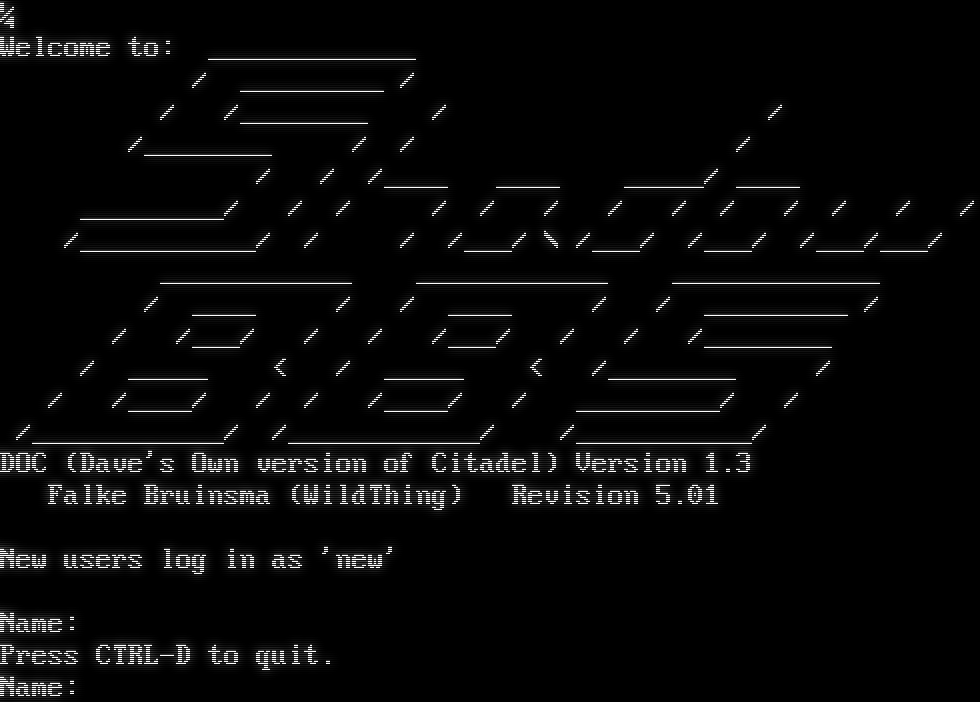 ¼ Welcome to: _​____________ / _​________ / / /_​_______ / / /_​_______ / / / / / /_​___ _​___ _​____/ _​___ _​________/ / / / / / / / / / / / / /_​__________/ / / /___/ \\ /___/ /___/ /___/___/ _​___________ _​___________ _​____________ / _​___ / / _​___ / / _​________ / / /___/ / / /___/ / / /_​_______ / _​____ < / _​____ < /_​_______ / / /_​___/ / / /_​___/ / _​________/ / /_​___________/ /_​___________/ /_​__________/ DOC (Dave's Own version of Citadel) Version 1.3 Falke Bruinsma (WildThing) Revision 5.01 New users log in as 'new' Name: Press CTRL-D to quit. Name: