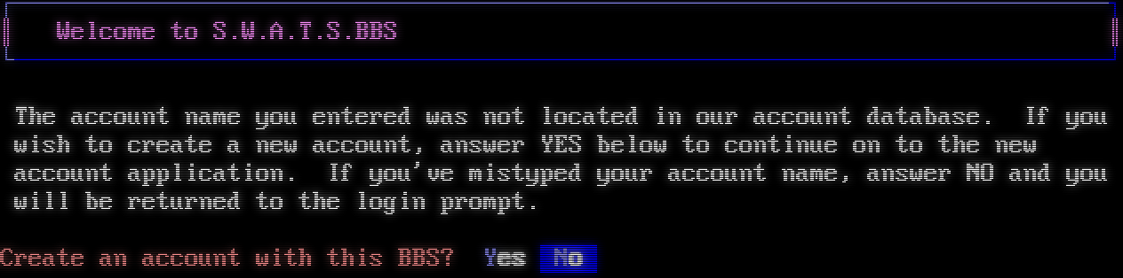 Mystic BBS Version 1.12 A46 Copyright (C) 1997-2020 By James Coyle Detecting terminal emulation: +​-------------------- -- - : botcheck v1.2 >> Phenom Productions : Connected to: S.W.A.T.S BBS Revisited (nODE_1) : Press a Key to Continue:) +​----------- -- - Press [.ESC.] twice within 15 seconds to CONTINUE... ┌┐ ┐┐┐ ┌┐ ┌┬┐ ┌┐┌┐ ┌┐ ┌┐ ││ │││ ├│ │ ││├┤ ├┤ ││ └┐ │││ ││ │ └┐││ ││ └┐ └┘ └┴┘ ┘┘ ┘ └┘└┘ └┘ └┘ Message Nets:- Family Net, Poofnet, FSXNET, Fidonet Telnet:- swatsbbs.ddns.net :2323 ─────────────────────────────────────────────────────────────────────────────── Wecome to S.W.A.T.S BBS Revisited ─────────────────────────────────────────────────────────────────────────────── [■] Enter your user name: ┌─────────────────────────────────────────────────────────────────────────────┐ ║ Welcome to S.W.A.T.S.BBS ║ └─────────────────────────────────────────────────────────────────────────────┘ The account name you entered was not located in our account database. If you wish to create a new account, answer YES below to continue on to the new account application. If you've mistyped your account name, answer NO and you will be returned to the login prompt. Create an account with this BBS? Yes No