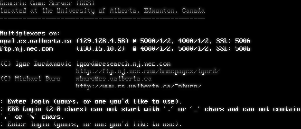 Generic Game Server (GGS) located at the University of Alberta, Edmonton, Canada -​----------------------------------------------------- Multiplexors on: opal.cs.ualberta.ca (129.128.4.58) @ 5000/1/2, 4000/1/2, SSL: 5006 ftp.nj.nec.com (138.15.10.2) @ 4000/1/2, 5000/1/2, SSL: 5006 (C) Igor Durdanovic igord@research.nj.nec.com http://ftp.nj.nec.com/homepages/igord/ (C) Michael Buro mburo@cs.ualberta.ca http://www.cs.ualberta.ca/~mburo/ : Enter login (yours, or one you'd like to use). : ERR Login (2-8 chars) can not start with '.' or '_' chars and can not contain ',' or '\\' chars. : Enter login (yours, or one you'd like to use).