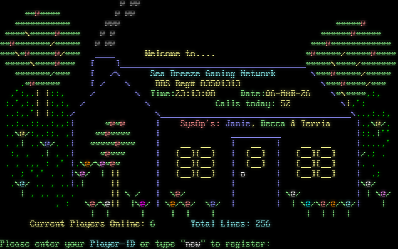 Auto-sensing...  !  @ @@ \*\*@\*\*\*\* @ @@ \*\*\*\*\*\*\*\*\*\*\* @@@ \*\*\*\*\*@ \*\*\*\*\\\*\*\*\*\*@\*\*\*\* @ @ \*\*\*\*\*\*@\*\*\*\*\* \*\*@\*\*\*\*\*\*\*/\*\*\*\*\* @ @@ \*\*\*@\*\*\*\*\*\*\*\*\*\*\*\* \*\*\*\\\*@\*\*\*\*\*@/\*\*\* _​___ Welcome to.​... \*@\*\*\*\*\*/\*\*\*\*\*@\*\*\*\* \*\*\*\*\*\\\*\*\*\*@\*\*\* [ ]_​____________________________________\*\*\*\*\*\\\*\*\*\*/\*\*\*\*\*\*\* \*\*\*\*\*\*\*/\*\*\* [ /\\ Sea Breeze Gaming Network \\\*\*\*@\*\*\*\*\*/\*\*\*\*\* .\*@\*\*\*\*\* [ / \\ BBS Reg# 83501313 \\\*\*\*@\*\*\*\*/\*\*\* ,';,.\| \|;:, / \\ Time:23:13:08 Date:06-MAR-26 \\\*\\\*\*\*\*,;, ;.',:.\| \|:,:, / \\ Calls today: 52 \\\|,'; ..:,.'\| \|;.;./ \\_​_____________________________________\\..,:.;, ..;..:;..:,,:\| \*@\*@ \| SysOp's: Jamie, Becca & Terria \|.,\\@/. ..\\@/:,.:;. ,\| \*\*@\*\*\*\* \| _​_________ \|:;.\|'' . ,\| ..\\@/. .\| \*\*\*\*\*@\*\*\* \| __ __ \| __ \| __ __ \|.​...,' :, , .\| , .\| \*@\*\*\* \| [__][__] \| [__] \| [__][__] \|/.; . . , .,, : ,' \|.\\@/\\@\*@\* \| [__][__] \| [__] \| [__][__] \|. . . ; ',' . . \|\\@/ \| \|\| \| [__][__] \| o \| [__][__] \| .; .\\@/ .. , ..\|.\| \|\| \| \| \| \|\\@/ \| , ,. ,, . \|\| \\ / \| \\@/ \| \| \\@/ \| \| \\@/ , : \\@/\\@\|\| \|\\@/ \| \\@/\\@/ \\@/ \| \| \| \\@/\\@/@/\\@/\| \| \| \| \| \| \| \| \| \| \| \| Current Players Online: 6 Total Lines: 256 Please enter your Player-ID or type "new" to register: