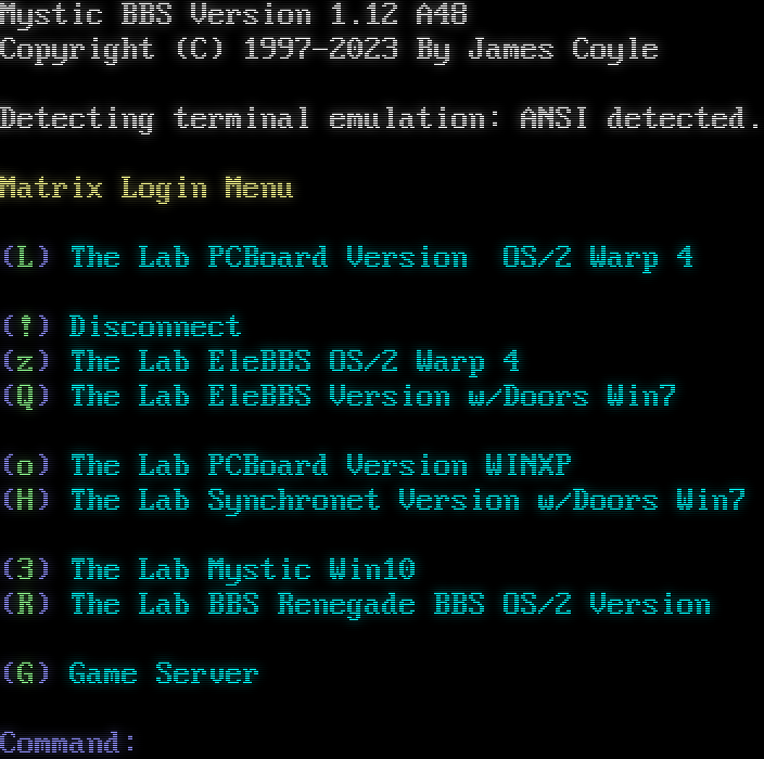 Mystic BBS Version 1.12 A48 Copyright (C) 1997-2023 By James Coyle Detecting terminal emulation: ANSI detected. Matrix Login Menu (L) The Lab PCBoard Version OS/2 Warp 4 (!) Disconnect (z) The Lab EleBBS OS/2 Warp 4 (Q) The Lab EleBBS Version w/Doors Win7 (o) The Lab PCBoard Version WINXP (H) The Lab Synchronet Version w/Doors Win7 (3) The Lab Mystic Win10 (R) The Lab BBS Renegade BBS OS/2 Version (G) Game Server Command: