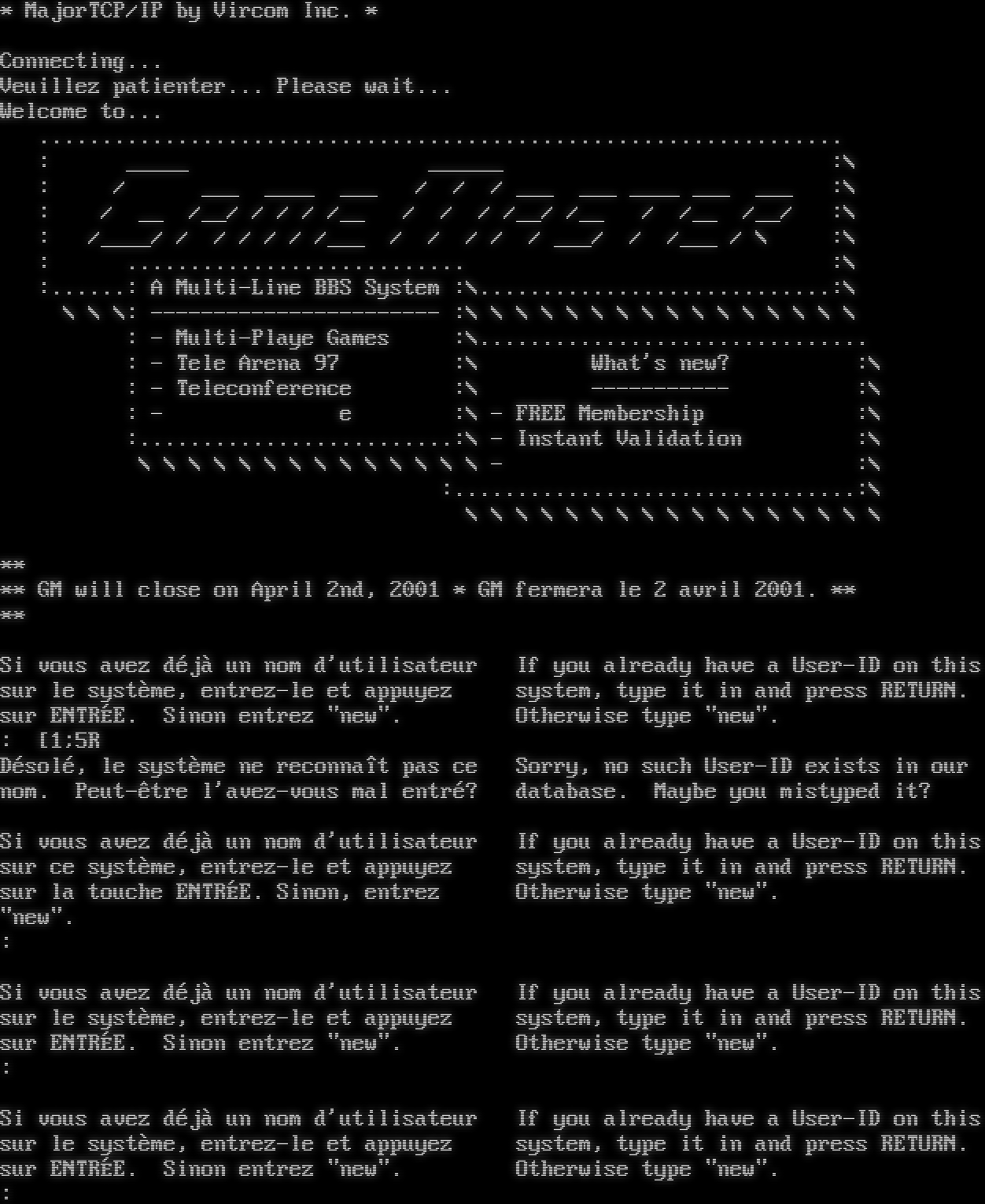 \* MajorTCP/IP by Vircom Inc. \* Connecting... Veuillez patienter... Please wait...  Welcome to... .​............................................................... : _​____ _​_____ :\\ : / ___ _​___ ___ / / / ___ ___ _​___ ___ ___ :\\ : / __ /__/ / / / /__ / / / /__/ /__ / /__ /__/ :\\ : /_​___/ / / / / / /___ / / / / / ___/ / /___ / \\ :\\ : .​.......................... :\\ :.​.....: A Multi-Line BBS System :\\.​...........................:\\ \\ \\ \\: -​---------------------- :\\ \\ \\ \\ \\ \\ \\ \\ \\ \\ \\ \\ \\ \\ \\ \\ : - Multi-Playe Games :\\.​.............................. : - Tele Arena 97 :\\ What's new? :\\ : - Teleconference :\\ -​---------- :\\ : - e :\\ - FREE Membership :\\ :.​........................:\\ - Instant Validation :\\ \\ \\ \\ \\ \\ \\ \\ \\ \\ \\ \\ \\ \\ \\ - :\\ :.​...............................:\\ \\ \\ \\ \\ \\ \\ \\ \\ \\ \\ \\ \\ \\ \\ \\ \\ \\ \*\* \*\* GM will close on April 2nd, 2001 \* GM fermera le 2 avril 2001. \*\* \*\* Si vous avez déjà un nom d'utilisateur If you already have a User-ID on this sur le système, entrez-le et appuyez system, type it in and press RETURN. sur ENTRÉE. Sinon entrez "new". Otherwise type "new". : [1;5R Désolé, le système ne reconnaît pas ce Sorry, no such User-ID exists in our nom. Peut-être l'avez-vous mal entré? database. Maybe you mistyped it? Si vous avez déjà un nom d'utilisateur If you already have a User-ID on this sur ce système, entrez-le et appuyez system, type it in and press RETURN. sur la touche ENTRÉE. Sinon, entrez Otherwise type "new". "new". : Si vous avez déjà un nom d'utilisateur If you already have a User-ID on this sur le système, entrez-le et appuyez system, type it in and press RETURN. sur ENTRÉE. Sinon entrez "new". Otherwise type "new". : Si vous avez déjà un nom d'utilisateur If you already have a User-ID on this sur le système, entrez-le et appuyez system, type it in and press RETURN. sur ENTRÉE. Sinon entrez "new". Otherwise type "new". :