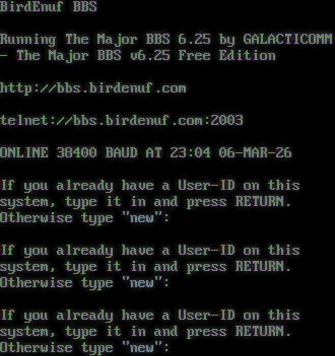 Auto-sensing... ! Party Like It's 1994 ! WELCOME! BirdEnuf BBS Running The Major BBS 6.25 by GALACTICOMM - The Major BBS v6.25 Free Edition http://bbs.birdenuf.com telnet://bbs.birdenuf.com:2003 ONLINE 38400 BAUD AT 23:04 06-MAR-26 If you already have a User-ID on this system, type it in and press RETURN. Otherwise type "new": If you already have a User-ID on this system, type it in and press RETURN. Otherwise type "new": If you already have a User-ID on this system, type it in and press RETURN. Otherwise type "new":