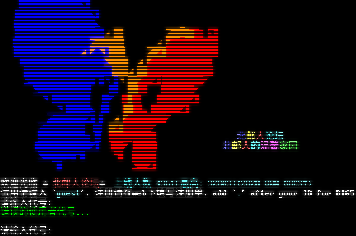 ▃▄▂▁ ◤ ◣ ◥ ▎ ◥ ◣ ▁ ▏ ◢ ◤ ▁▇▇◥ ▊ ◤ ▏ ◢◤ ▉ ◢◤◥ ▍ ◤◢ ▎ ◣ ◢◤ ▉ ▊ ◢ ▏ ▏ ◣ ▆◥ ◥ ◤ ◢▎ ◤ ◣ ▎ ▏ ▏▏▏ ▏ ◤ ◥ ︳▋◤▊▉▊ ▎ ◢ ◥ ◣▍▏ ▏▏▃ ◢ ◤ ◢ ▉ ◢◤ ◤ ◤ ▕ ▊▋ ◢ ◤ ▆ ▎▏ 北邮人论坛 ▍ ◢ ▍ ◤︳ ▏ 北邮人的温馨家园 ◣ ▁▅ ▅ ▇ ◣ ◢ 欢迎光临 ◆北邮人论坛◆ 上线人数 4361[最高: 32803](2828 WWW GUEST) 试用请输入 \`guest', 注册请在web下填写注册单, add \`.' after your ID for BIG5 请输入代号: 错误的使用者代号... 请输入代号: