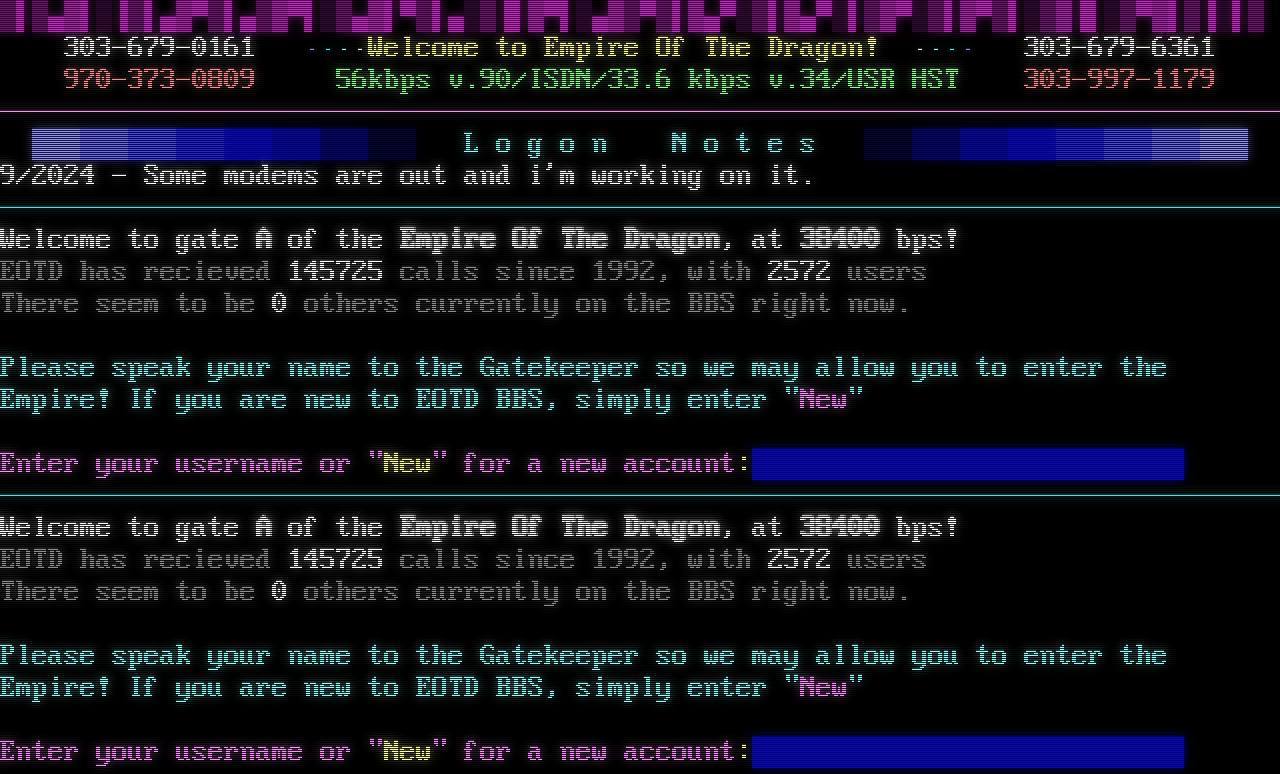 Checking for ANSI... !  Choose a display protocol (Most common is English/ANSI): 1. English/ANSI The standard English language version 2. English/RIP The English version of RIPscrip graphics Choose a number from 1 to 2: 1 Can you display color ANSI graphics? (Y/N): y ░▀█▒▐▓▌▄░▌▒▒▄▓▌▀█▐▀░▐▌▄▒▓▐█■▐▒▌▄▓░▐▌█▀▒▐▌▓▄░▐▌▒▓▄▐▌█▀▒▐▓▌▄░▒▐▌▓▄▒▌▀░▌▐▓▄▌▒▀░▌▒▌ ▀▒▐░▌▄▒▌▀▓▌▐▒▄▓▐▌░▀▓▐▌▄░▒▌▀▓▌▐░▄▒▓▀▌░▒▄▓▀▌░▒▄▓▀▓▌▒▄░▀▒▓▌▄░▒▌▓▀▌▒▄▀░▐▌▒▄▓▀▓▌▒▄▀▌ ▒▐▌▓▄▓░▐▌▒▄▒▐▌▒▓▄░▐▌▒▓▄░▐▌▒▄▓▌▒▄▒▌▒▌░▐▌▒▄▓▌▒▐░▌▒▌▒▄▓▌▒▐░▌▒▄▓▌▒▐░▌▒▄▓▌▒▐░▌▒▄▓▌░▌ ··············································································· ·· ·· ·· ·· ·· ·· ·· ·· ··▄▄▄▄·· ·· ·· ·▄▄▄▄▄███▀▀ ▀▀ ▀· ·· ·· ·· ·· ·· ·· ··· ·· ·· ·· ·· ·· ·· ·▄▄·▀██▀▀▀· ·▄ ▀▀▄▄▄ ·▀██▀▀ ▄▄· ▄██▄ ▄▄ ·· ·· ·· ·· ·· ·· · · · · · · ·███▀ · · ·█ · ·▀█· · ·███▀ ▄██▀ · ▀ · ▌· · · · · ▐ ██▀ ▄▄▄▄ █▌ ▐█▌ ██▀ ██▀ █ ▐▐ ▐ ▌▌ ▌ ██ ██▀▀ ▀ ▀█ ██ ██ █▀ ▌ ▌ ▌ ▌▌▌ ▌ ▐ ▐ ▐ ▐▐ ▐ █▀ ▄██▄ ██ █▀ █▀ ▄█▀ ▐ ▐ ▐▐▐ ▐▐ ▐ ▐▐▄ ▌▌▌ ▌ ▌ ▌▌▌▀ █ ▄ ▄▄███▀▀ ▀████▀▀ █ █ ▄█████▀▀ ▀▌▌ ▌▌ ▌ ▌▌▌▌ ▌ ▐ ▐▐ ▐ ▀ ██▀▀ ▀ ▄ ▀▀ ▐ ▐ ▐ ▐ · ·▌ · ·▀ · · · · · · · · · ▀· ·▀ · · · · · · · · · · · · · · · · · · · · · · · · · ·▄ · · · · · · · · · · · · · · · ·▀ · · · · · · · · · · · · · · · · · · · · · · · · · · · · · · · · · · · · · · · · · · · · · · · · · · · · · · · · · · · · · · · · · · · · · · · · · · · · · · · · · · · · · · · · · · · · · · · · · · · · · · · ░▒▓▀▓▌▒▄▀▄▓░▐▌▀█▌▒▐░▄▓▐▒▌▀▓▐▌▄░▐▒▀▓▐▌▀░▒▌▓▄▐▌█▀▒░▌▓▄▒▀░▐▌▒▓▄▒▀▌░▒▄▓▀▀▒▌░▐▌▒▀▓▒▐ ▒▐▌▄▓▐▌░▒▄▓▌▒▀▌▐░▒▓▀▒░▐▌▒▓▄▐▒▌▀▓▐░▌▒▄▒▀▓█▌▒▄▌░▐▒▌▓▀▒▐▌▒▀█▌▒▐░▌▒▓▄█▀▒▌▒▐▌▓▄▒▀░▒▓ ▒▌▒▄▓▌░▐▒▌▄▓▀▒▌▄▒▓▀▌░▒▄▓▌▀▒▌▄░▒▐▌▓▀▌░▄▓▒▀▒▌▓▄▀░▒▌▓▄▀░▌▒▓▀░▒▌▓▀▒▌░▒▓▐▌░▒▀▓▌▒▐░▌▒ 303-679-0161 ····Welcome to Empire Of The Dragon! ···· 303-679-6361 970-373-0809 56kbps v.90/ISDN/33.6 kbps v.34/USR HST 303-997-1179 ──────────────────────────────────────────────────────────────────────────────── ███▓▓▓▒▒▒░░░ ▓▓▓▒▒▒░░░ L o g o n N o t e s ░░░▒▒▒▓▓▓███░░░▒▒▒▓▓▓███ 9/2024 - Some modems are out and i'm working on it. ──────────────────────────────────────────────────────────────────────────────── Welcome to gate A of the Empire Of The Dragon, at 38400 bps! EOTD has recieved 145725 calls since 1992, with 2572 users There seem to be 0 others currently on the BBS right now. Please speak your name to the Gatekeeper so we may allow you to enter the Empire! If you are new to EOTD BBS, simply enter "New" Enter your username or "New" for a new account: ──────────────────────────────────────────────────────────────────────────────── Welcome to gate A of the Empire Of The Dragon, at 38400 bps! EOTD has recieved 145725 calls since 1992, with 2572 users There seem to be 0 others currently on the BBS right now. Please speak your name to the Gatekeeper so we may allow you to enter the Empire! If you are new to EOTD BBS, simply enter "New" Enter your username or "New" for a new account: