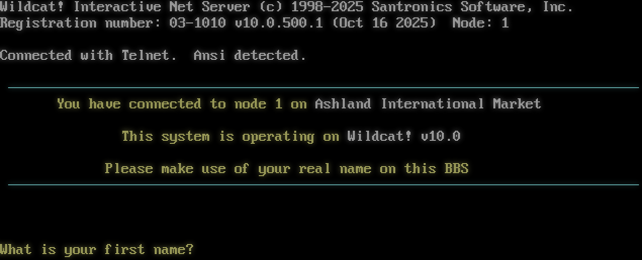 <WC250003-1010981778365E26E901EB> Wildcat! Interactive Net Server (c) 1998-2025 Santronics Software, Inc. Registration number: 03-1010 v10.0.500.1 (Oct 16 2025) Node: 1 Connected with Telnet. Ansi detected. ────────────────────────────────────────────────────────────────────────────── You have connected to node 1 on Ashland International Market This system is operating on Wildcat! v10.0 Please make use of your real name on this BBS ────────────────────────────────────────────────────────────────────────────── What is your first name?