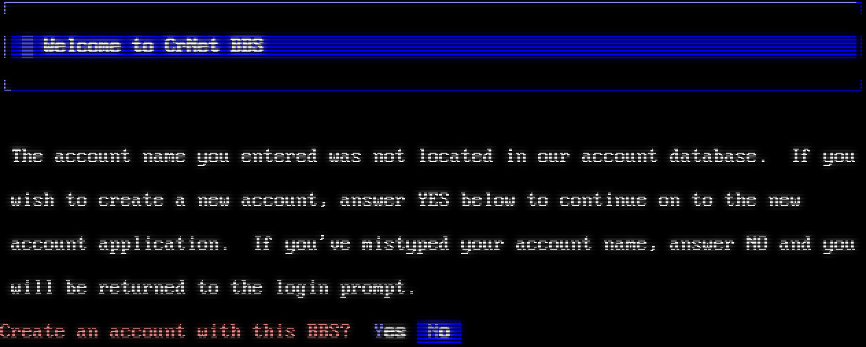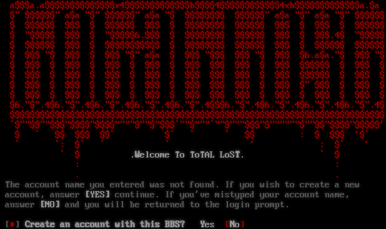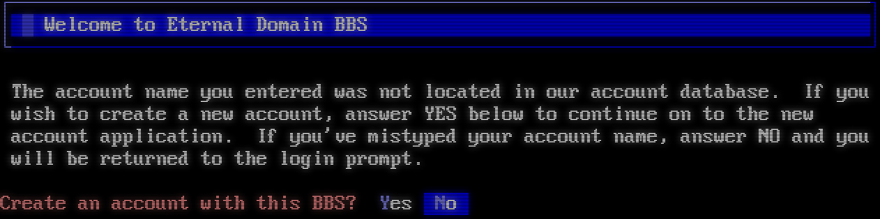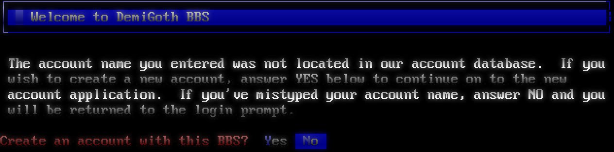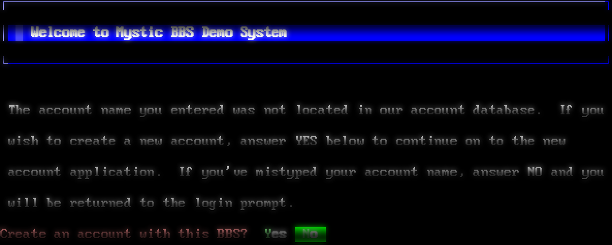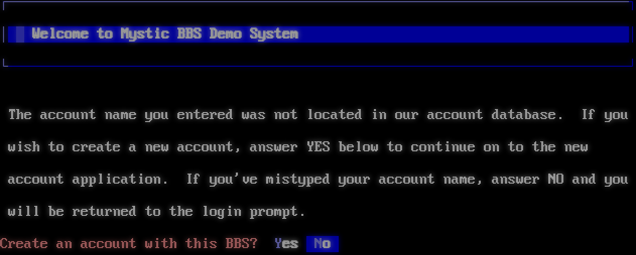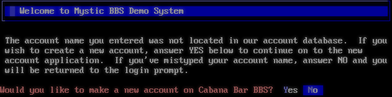 Mystic BBS Version 1.12 A47 Copyright (C) 1997-2021 By James Coyle Detecting terminal emulation: ANSI detected. \\_/ --(_)-- / \\ ,-, .​----. \|-\| /_​_____\\ __ __ \| \| \| __ \| (())()) \| \| \| \|><\| \| )( )( .-''''''''''''-.-'''''''-. The ByteBarn ─────────────────────────────────────────────────────────────────────────────── Welcome to Bytebarn BBS System ─────────────────────────────────────────────────────────────────────────────── [■] Enter your user name: ┌─────────────────────────────────────────────────────────────────────────────┐ │ ▒ Welcome to Mystic BBS Demo System │ └─────────────────────────────────────────────────────────────────────────────┘ The account name you entered was not located in our account database. If you wish to create a new account, answer YES below to continue on to the new account application. If you've mistyped your account name, answer NO and you will be returned to the login prompt. Create an account with this BBS? Yes No
