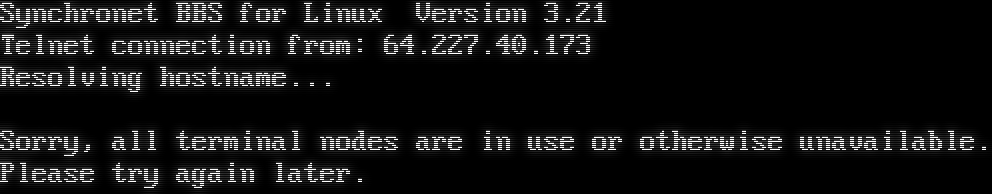 Synchronet BBS for Linux Version 3.21 Telnet connection from: 64.227.40.173 Resolving hostname... Sorry, all terminal nodes are in use or otherwise unavailable. Please try again later.