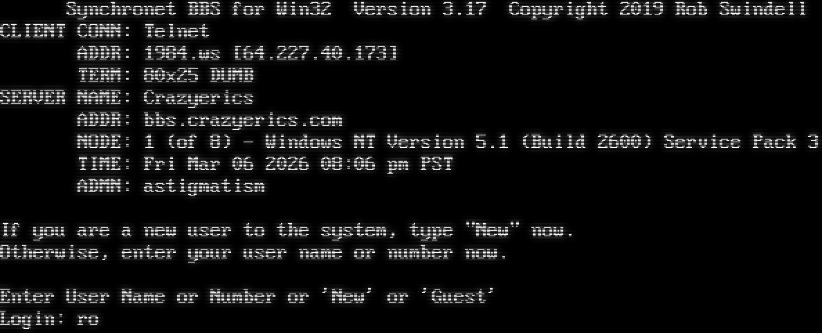 Synchronet BBS for Win32 Version 3.17 Telnet connection from: 64.227.40.173 Resolving hostname... __ Synchronet BBS for Win32 Version 3.17 Copyright 2019 Rob Swindell CLIENT CONN: Telnet ADDR: 1984.ws [64.227.40.173] TERM: 80x25 DUMB SERVER NAME: Crazyerics ADDR: bbs.crazyerics.com NODE: 1 (of 8) - Windows NT Version 5.1 (Build 2600) Service Pack 3 TIME: Fri Mar 06 2026 08:06 pm PST ADMN: astigmatism If you are a new user to the system, type "New" now. Otherwise, enter your user name or number now. Enter User Name or Number or 'New' or 'Guest' Login: ro