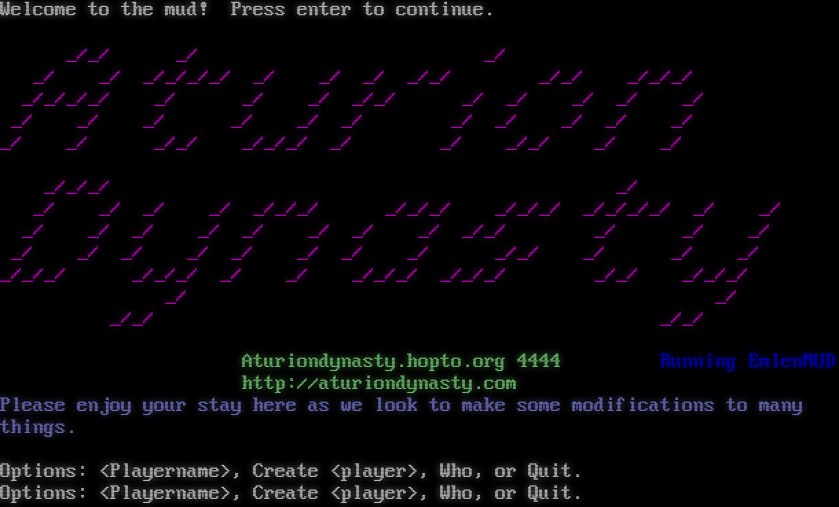 Welcome to the mud! Press enter to continue. _/_/ _/ _/ _/ _/ _/_/_/_/ _/ _/ _/ _/_/ _/_/ _/_/_/ _/_/_/_/ _/ _/ _/ _/_/ _/ _/ _/ _/ _/ _/ _/ _/ _/ _/ _/ _/ _/ _/ _/ _/ _/ _/ _/_/ _/_/_/ _/ _/ _/_/ _/ _/ _/_/_/ _/ _/ _/ _/ _/ _/_/_/ _/_/_/ _/_/_/ _/_/_/_/ _/ _/ _/ _/ _/ _/ _/ _/ _/ _/ _/_/ _/ _/ _/ _/ _/ _/ _/ _/ _/ _/ _/ _/_/ _/ _/ _/ _/_/_/ _/_/_/ _/ _/ _/_/_/ _/_/_/ _/_/ _/_/_/ _/ _/ _/_/ _/_/ Aturiondynasty.hopto.org 4444 Running EmlenMUD http://aturiondynasty.com Please enjoy your stay here as we look to make some modifications to many things. Options: <Playername>, Create <player>, Who, or Quit. Options: <Playername>, Create <player>, Who, or Quit.