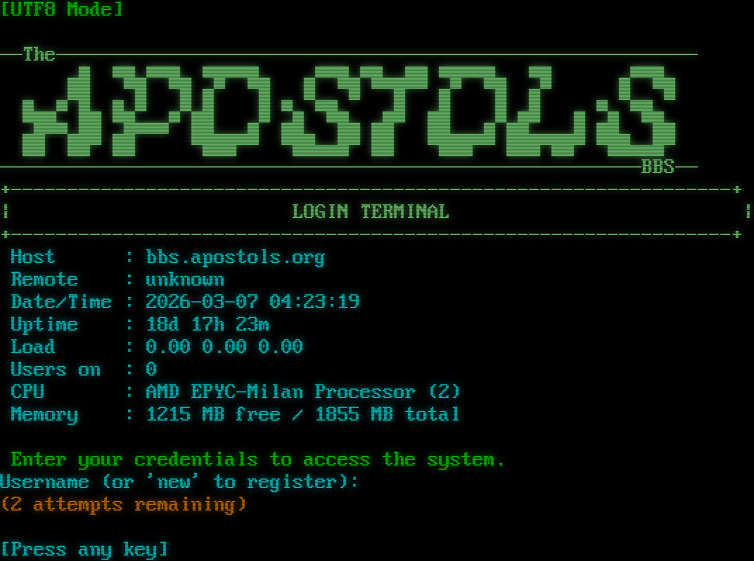 [UTF8 Mode] ──The───────────────────────────────────────────────────────── ▄█ ▀█▄▀▀█▄ ▀█▀▀█▄ ▄▀▀█▄▀█▄▄██ ▀█▀▀█▄ ▀█ ▄▀▀█▄ ▄ ▄▀█ ▄ █ █ █ █ ▄ ▀▄▄ ▀ █ █ █ █ ▄ ▀▄▄ ▀ ▀██▄ ██ ▀█▄▄▄▀ ██ ▄▀ ▄█ ▀█▄ ▄█▀ ██ ▄▀▄█▀ █ ▄█ ▀█▄ ██ ██▀ ██ ▀███▀▀ ▀██▄▄█▀ ██ ▀███▀▀ ███▀██▀ ▀██▄▄█▀ ─────────────────────────────────────────────────────────BBS── +​----------------------------------------------------------------+ \| LOGIN TERMINAL \| +​----------------------------------------------------------------+ Host : bbs.apostols.org Remote : unknown Date/Time : 2026-03-07 04:23:19 Uptime : 18d 17h 23m Load : 0.00 0.00 0.00 Users on : 0 CPU : AMD EPYC-Milan Processor (2) Memory : 1215 MB free / 1855 MB total Enter your credentials to access the system. Username (or 'new' to register): (2 attempts remaining) [Press any key]