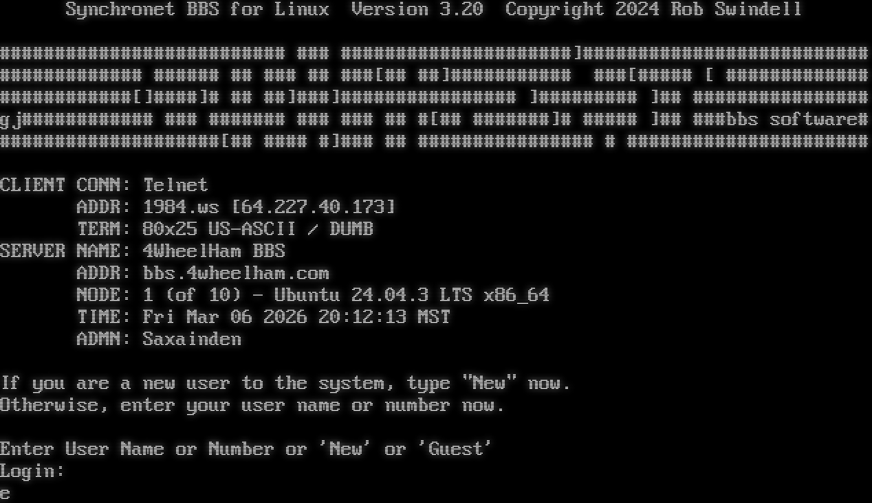 Synchronet BBS for Linux Version 3.20 Telnet connection from: 64.227.40.173 Resolving hostname... _ _ Synchronet BBS for Linux Version 3.20 Copyright 2024 Rob Swindell #​######################### ### #​####################]#​######################### #​############ #​##### ## ### ## ###[## ##]#​########## ###[#​#### [ #​############ #​###########[]#​###]# ## ##]###]#​############### ]#​######## ]## #​############### gj#​########### ### #​###### ### ### ## #[## #​######]# #​#### ]## ###bbs software# #​###################[## #​### #]### ## #​############### # #​##################### CLIENT CONN: Telnet ADDR: 1984.ws [64.227.40.173] TERM: 80x25 US-ASCII / DUMB SERVER NAME: 4WheelHam BBS ADDR: bbs.4wheelham.com NODE: 1 (of 10) - Ubuntu 24.04.3 LTS x86_64 TIME: Fri Mar 06 2026 20:12:13 MST ADMN: Saxainden If you are a new user to the system, type "New" now. Otherwise, enter your user name or number now. NN: Enter User Name or Number or 'New' or 'Guest' Login: Bee