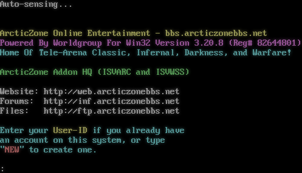 Auto-sensing...  !  ArcticZone Online Entertainment - bbs.arcticzonebbs.net Powered By Worldgroup For Win32 Version 3.20.8 (Reg# 82644801) Home Of Tele-Arena Classic, Infernal, Darkness, and Warfare! ArcticZone Addon HQ (ISVARC and ISVWSS) Website: http://web.arcticzonebbs.net Forums: http://inf.arcticzonebbs.net Files: http://ftp.arcticzonebbs.net Enter your User-ID if you already have an account on this system, or type "NEW" to create one. :