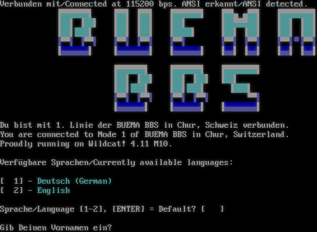 <WC12026030704240591304015845>WILDCAT! Copyright (c) 87,95 Mustang Software, Inc. All Rights Reserved.  Registration Number: 91-3040. v4.11 M10(MultiLine 10). Node: 1. Verbunden mit/Connected at 115200 bps. ANSI erkannt/ANSI detected. ▐▄▄▄▄▄▄▌ ▐▄▄▌ ▐▄▄▌ ▐▄▄▄▄▄▄▌ ▐▄▄▄ ▄▄▄▌ ▐▄▄▄▄▄▄▄▌ ▐██▌ ▐██▌ ▐██▌ ▐██▌ ▐██▌ ▐██▄▄▄██▌ ▐██▌ ▐██▌ ▐██▌███▌ ▐██▌ ▐██▌ ▐████▌ ▐██▌ ▐██▌ ▐██▌ ▐██▌ ▐▀▀▌ ▐▀▀▌ ▐▀▀▌ ▐▀▀▌ ▐▀▀▌ ▐▀▀▌ ▐▀▀▌ ▐▀▀▌▀▐▀▀▌ ▐▄▄▄▄▄▄▌ ▐▄▄▄▄▄▄▄▌ ▐▄▄▄▄▄▄▌ ▐▄▄▌ ▐▄▄▌ ▐▄▄▌ ▐▄▄▌ ▐▄▄▄▄▄▄▌ ▐▄▄▄▄▄▄▌ ▐▄▄▄▄▄▄▄▌ ▐██▌ ▐██▌ ▐██▌ ▐██▌ ▐██▌ ▐██▌███▌ ▐██▌███▌ ▐███▌ ▐▀▀▌ ▐▀▀▌ ▐▀▀▌ ▐▀▀▌ ▀▀▌ ▐▄▄▄▄▄▄▌ ▐▄▄▄▄▄▄▌ ▐▄▄▄▄▄▄▄▌ Du bist mit 1. Linie der BUEMA BBS in Chur, Schweiz verbunden. You are connected to Node 1 of BUEMA BBS in Chur, Switzerland. Proudly running on Wildcat! 4.11 M10. Verfügbare Sprachen/Currently available languages: [ 1] - Deutsch (German) [ 2] - English Sprache/Language [1-2], [ENTER] = Default? [ ] Gib Deinen Vornamen ein?