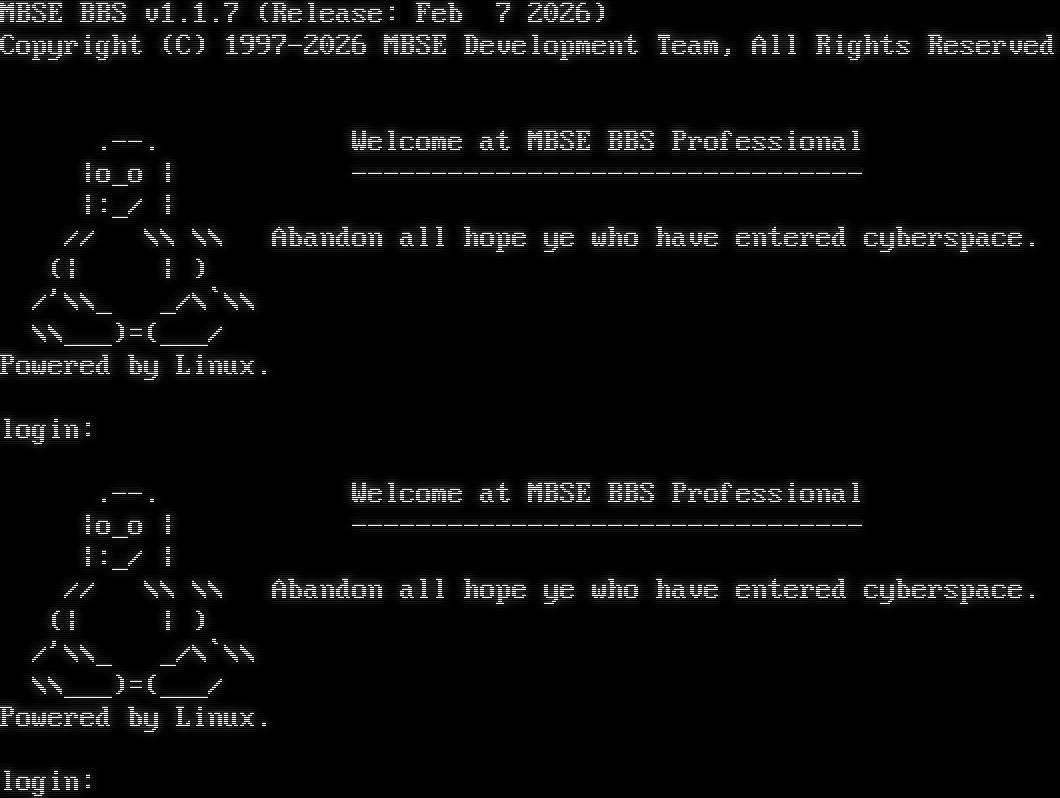 Kernel 4.18.0-553.104.1.el8_10.x86_64 on an x86_64 MBSE BBS v1.1.7 (Release: Feb 7 2026) Copyright (C) 1997-2026 MBSE Development Team, All Rights Reserved .​--. Welcome at MBSE BBS Professional \|o_o \| -​------------------------------- \|:_/ \| // \\\\ \\\\ Abandon all hope ye who have entered cyberspace. (\| \| ) /'\\\\_ _/\\\`\\\\ \\\\___)=(___/ Powered by Linux. login: .​--. Welcome at MBSE BBS Professional \|o_o \| -​------------------------------- \|:_/ \| // \\\\ \\\\ Abandon all hope ye who have entered cyberspace. (\| \| ) /'\\\\_ _/\\\`\\\\ \\\\___)=(___/ Powered by Linux. login: