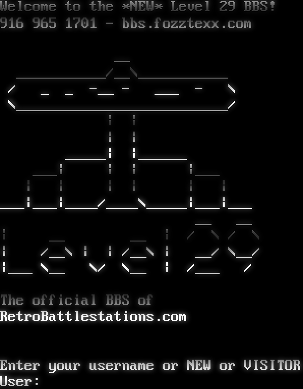 Welcome to the \*NEW\* Level 29 BBS! 916 965 1701 - bbs.fozztexx.com __ _​__________/__\\_​__________ / _ _ -__ - ___ - \\ \\_​_________________________/ \| \| \| \| _​____\| \|_​_____ ___\| \| \| \|___ \| \| \| \| \| \| ___\|___\|_​___/_​___\\_​____\|___\|___ __ __ \| __ __ \| / \\ / \\ \| /__\\ \| \| /__\\ \| __/ \\__/ \|___ \\__ \\/ \\__ \| /___ / The official BBS of RetroBattlestations.com Enter your username or NEW or VISITOR User: