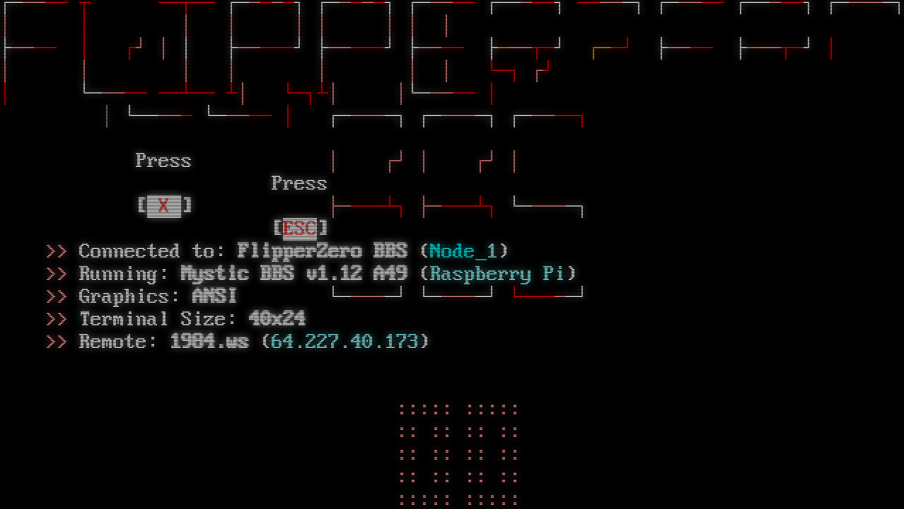 Mystic BBS Version 1.12 A49 Copyright (C) 1997-2023 By James Coyle Detecting terminal emulation: WWWeeelllcccooommmeee.​........ ┌───── ┬──┬── ┌─────┐ ┌─────┐ ┌───── ┌─────┐ ─────┐ ┌───── ┌─────┐ ┌─────┐│││ ││ ││ │││┌┘ │││ ││├──── ││ ├─────┘ ├─────┘ ├──── ├───┬─┘ ┌──┘ ├──── ├───┬─┘ │││││ ││││ └─┐ ┌┘││ └─┐ │││└───── ──┴── ┴┴└───── ││ └───── └───── ││ └─────┘┌─────┐ ┌─────┐ ┌─────┐ Press│ ┌┘ │ ┌┘ │Press [ X ]├────┴┐ ├────┴┐ └─────┐[ESC] Twice││ │││Twice └─────┘ └─────┘ └─────┘ >> Connected to: FlipperZero BBS (Node_1) >> Running: Mystic BBS v1.12 A49 (Raspberry Pi) >> Graphics: ANSI >> Terminal Size: 40x24 >> Remote: 1984.ws (64.227.40.173) ::::: ::::: :: :: ::::::: :: :::: :: ::::::: ::::: ::: ::::: :: :: :: :: ::::: :: :: :::: ::::: ::: ::::: :: :: :: :: ::::: :: :: :: :::: ::::: ::: ::::: :: :: :: :: :: :: :::: :: ::: ::::: :: :: :: ::::: :: :: :: :::: ::::: ::: ::::: :: :: :: ::::: :: :: :::: ::::: ::: :: :: :: :: :: :: ::::: :: :: :::: :: ::: ::::: :: :: :: :::: :: :: :::: ::::: ::: ::::: :: :: :: ::::: :: :: :::: ::::: ::: ::: :: :: :: :: :: :: :::: :::: ::: ::::: :: :: :: :: :: :: :: :: :: :::: :::::::::: ::::::: :: :: :::: :: ::::::: :: ::::::: :::::::::: ::::::: :: :: :::: :: ::::::: :: :: ::::::: :::::::::: ::::::: :: :::: :: :::: :: ::::::: ::::::: ::::::: :: :: :: :: ::::::: :: :: ::::::: :::::::::: ::::::: :: :: :: :: ::::::: :: ::::::: :::::::::: :: :::: :: :: :::: :: ::::::: :: ::::::: ::::::: ::::::: :: :::: :: :::::: :: ::::::: ::::: ::::: ::::::: :: :::: :: ::::::: :: :: ::::: :::::::::: ::: :: :: :: :: :: :: :: :: :: ::::: ::::::::: ::::::: :: :: :::: :: :: :::: :: :: ::::::: :::::