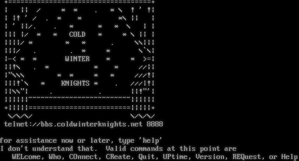 +​===================================+ \| \|\| / \* \* . \* \\ ! ' !\| \| \|! ' / . \* \* \*\\ \|\| \| \| ' \|\|/. . \* \* \* \\ \| \| \|\|\| \|/ \* \* COLD \* \* \\ \|\| \| \|\|\|\|/ \* \* \* . \\\\\|\|\| \|\|\|/ . . \* \* \\\`\\\| \|-< \* \* WINTER \* \* >=\| \|\|!\\ . \* \* \* //\|\| \|"\\\\\\ \* \* \* \* ///!\| \|\|\|!\`\\ \* KNIGHTS \* . ///\|!\| \|\|\\\\"\| . . \|\|!"'\| \|\|\|\|\|\|~​~~~~~~~~~~~~~~~~~~~~~~~~\|\|\|\|\|\| +\|\|\|\|\|=​========================\|\|\|\|\|+ \\/\\/\\/ \\/\\/\\/ telnet://bbs.coldwinterknights.net 8888 for assistance now or later, type 'help' I don't understand that. Valid commands at this point are WELcome, Who, COnnect, CReate, Quit, UPtime, Version, REQuest, or Help