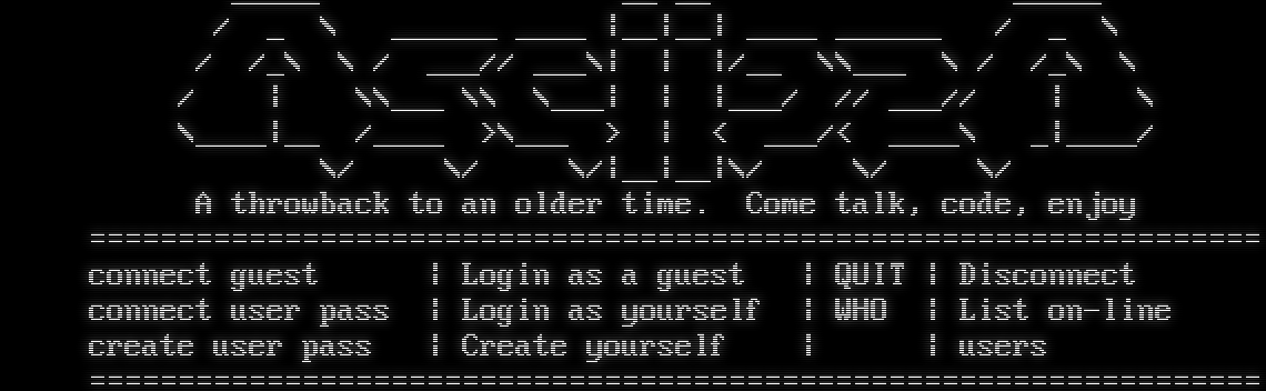 _​____ __ __ _​____ / _ \\ _​_____ _​___ \|__\|__\| _​___ _​_____ / _ \\ / /_\\ \\ / ___// ___\\\| \| \|/__ \\\\___ \\ / /_\\ \\ / \| \\\\___ \\\\ \\___\| \| \|___/ // ___// \| \\ \\_​___\|__ /_​___ >\\___ > \| < ___/< _​___\\ _\|_​___/ \\/ \\/ \\/\|__\|__\|\\/ \\/ \\/ A throwback to an older time. Come talk, code, enjoy =​================================================================= connect guest \| Login as a guest \| QUIT \| Disconnect connect user pass \| Login as yourself \| WHO \| List on-line create user pass \| Create yourself \| \| users =​=================================================================