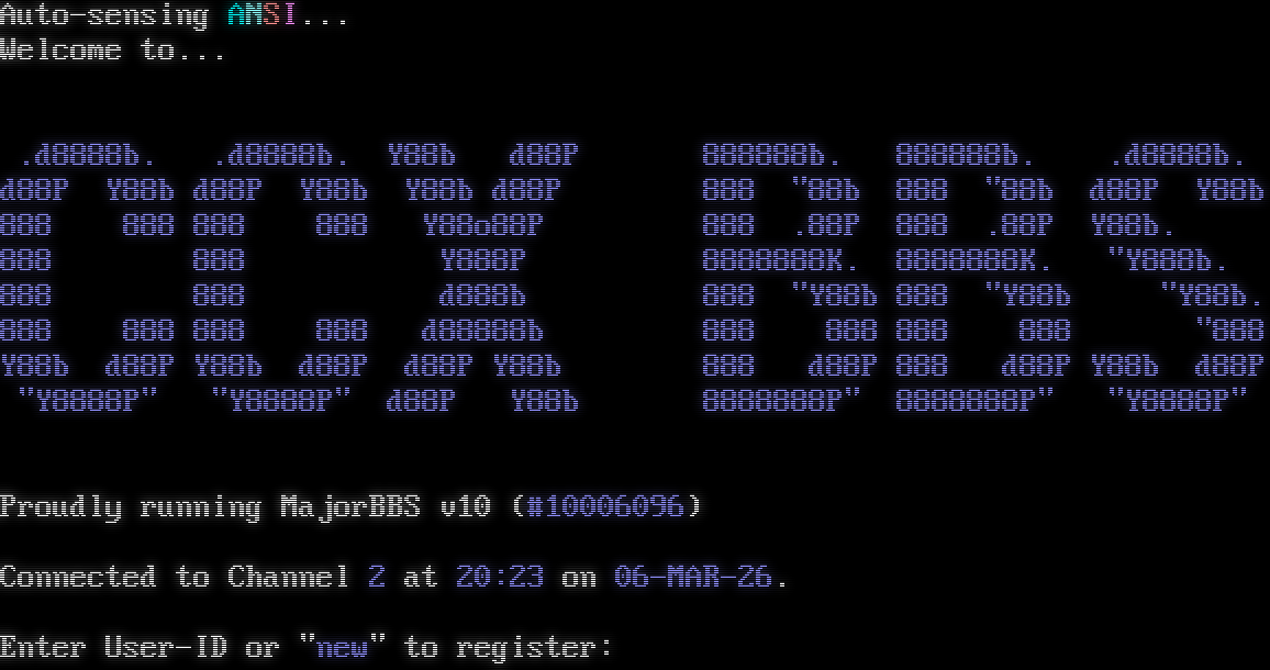 Auto-sensing ANSI...  ! Welcome to... .d8888b. .d8888b. Y88b d88P 888888b. 888888b. .d8888b. d88P Y88b d88P Y88b Y88b d88P 888 "88b 888 "88b d88P Y88b 888 888 888 888 Y88o88P 888 .88P 888 .88P Y88b. 888 888 Y888P 8888888K. 8888888K. "Y888b. 888 888 d888b 888 "Y88b 888 "Y88b "Y88b. 888 888 888 888 d88888b 888 888 888 888 "888 Y88b d88P Y88b d88P d88P Y88b 888 d88P 888 d88P Y88b d88P "Y8888P" "Y8888P" d88P Y88b 8888888P" 8888888P" "Y8888P" Proudly running MajorBBS v10 (#10006096) Connected to Channel 2 at 20:23 on 06-MAR-26. Enter User-ID or "new" to register: