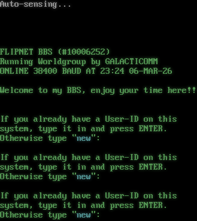 Auto-sensing...  !  WELCOME! FLIPNET BBS (#10006252) Running Worldgroup by GALACTICOMM ONLINE 38400 BAUD AT 23:24 06-MAR-26 Welcome to my BBS, enjoy your time here!! If you already have a User-ID on this system, type it in and press ENTER. Otherwise type "new": If you already have a User-ID on this system, type it in and press ENTER. Otherwise type "new": If you already have a User-ID on this system, type it in and press ENTER. Otherwise type "new":