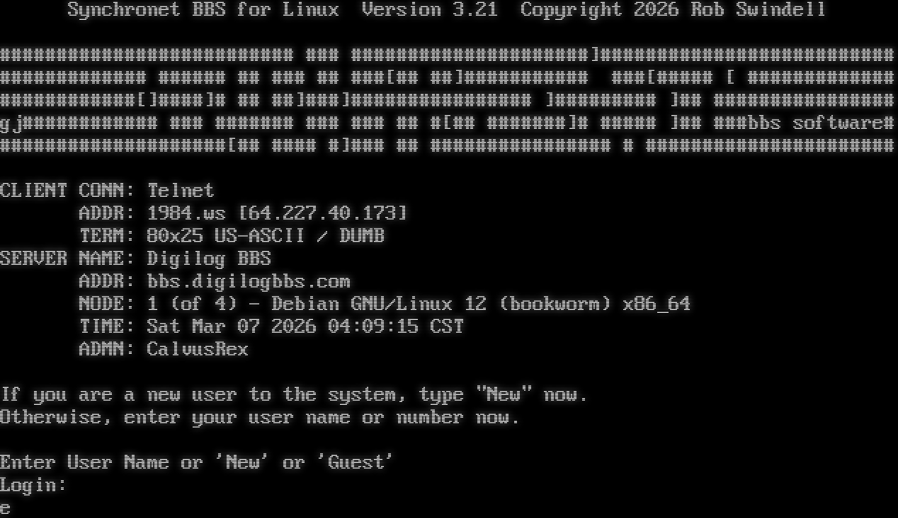 Synchronet BBS for Linux Version 3.21 Telnet connection from: 64.227.40.173 Resolving hostname... _ ∩╗┐ Synchronet BBS for Linux Version 3.21 Copyright 2026 Rob Swindell #​######################### ### #​####################]#​######################### #​############ #​##### ## ### ## ###[## ##]#​########## ###[#​#### [ #​############ #​###########[]#​###]# ## ##]###]#​############### ]#​######## ]## #​############### gj#​########### ### #​###### ### ### ## #[## #​######]# #​#### ]## ###bbs software# #​###################[## #​### #]### ## #​############### # #​##################### CLIENT CONN: Telnet ADDR: 1984.ws [64.227.40.173] TERM: 80x25 US-ASCII / DUMB SERVER NAME: Digilog BBS ADDR: bbs.digilogbbs.com NODE: 1 (of 4) - Debian GNU/Linux 12 (bookworm) x86_64 TIME: Sat Mar 07 2026 04:09:15 CST ADMN: CalvusRex If you are a new user to the system, type "New" now. Otherwise, enter your user name or number now. Enter User Name or 'New' or 'Guest' Login: Bee