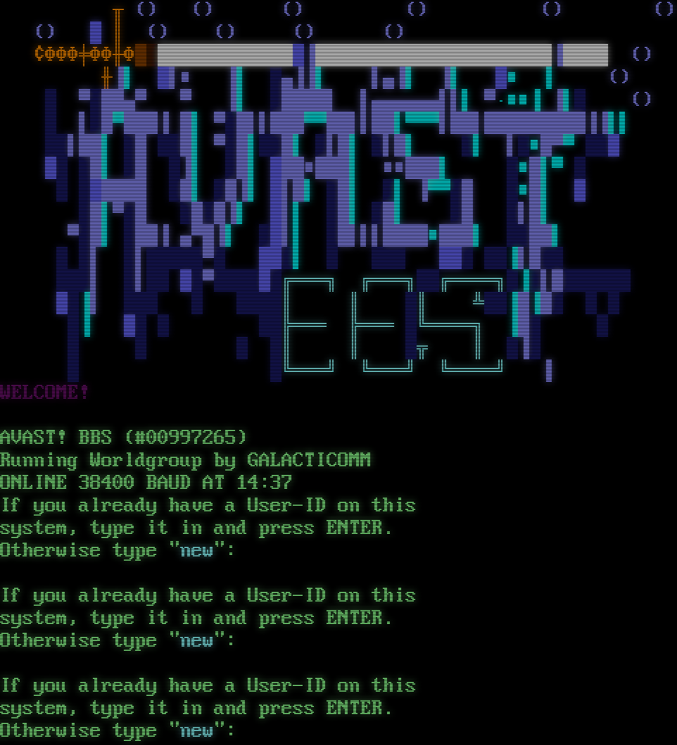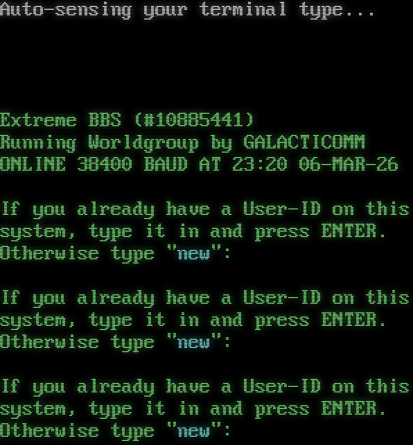 Auto-sensing your terminal type...  !  WELCOME! Extreme BBS (#10885441) Running Worldgroup by GALACTICOMM ONLINE 38400 BAUD AT 23:20 06-MAR-26 If you already have a User-ID on this system, type it in and press ENTER. Otherwise type "new": If you already have a User-ID on this system, type it in and press ENTER. Otherwise type "new": If you already have a User-ID on this system, type it in and press ENTER. Otherwise type "new":