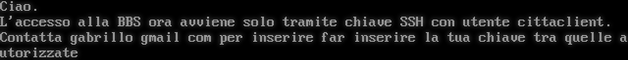 Ciao. L'accesso alla BBS ora avviene solo tramite chiave SSH con utente cittaclient. Contatta gabrillo gmail com per inserire far inserire la tua chiave tra quelle autorizzate