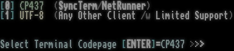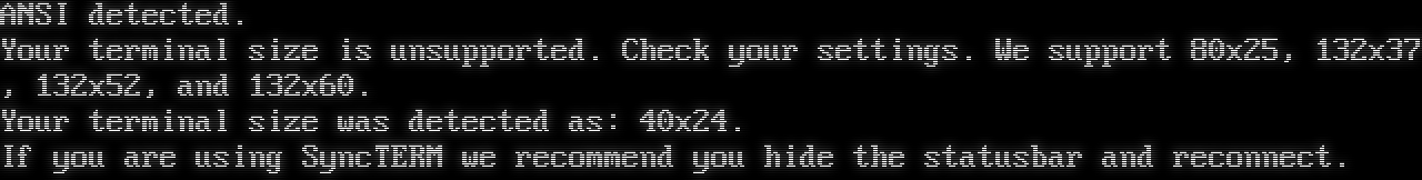 ANSI detected. Your terminal size is unsupported. Check your settings. We support 80x25, 132x37, 132x52, and 132x60. Your terminal size was detected as: 40x24. If you are using SyncTERM we recommend you hide the statusbar and reconnect.