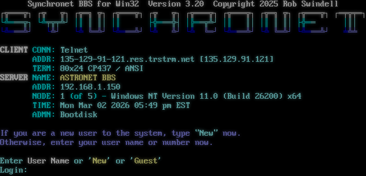 Synchronet BBS for Win32 Version 3.20 Telnet connection from: 135.129.91.121 Resolving hostname... _ ∩╗┐_ Synchronet BBS for Win32 Version 3.20 Copyright 2025 Rob Swindell ┌╦═══╦┐ ┌╦╦┐ ┌╦═╗ ╦┐ ┌╦═══╦┐ ┌╦╦┐ ┌╦═══╦┐ ┌╦═══╦┐ ┌╦═╗ ╦┐ ┌╦═══╦┐ ┌═╤╦╤═┐ └╩═══╦┐ └╩╤╦╤╩┘ │║ ║ ║│ │║├╬═══╬┤ │╠══╦╩┘ │║║│ │║ ║ ║│ ├╬══│║│ └╩═══╩┘└╩┘└╩ ╚═╩┘ └╩═══╩┘ └╩╩┘ └╩ ╚═┘ └╩═══╩┘ └╩ ╚═╩┘ └╩═══╩┘╧╩╧ CLIENT CONN: Telnet ADDR: 135-129-91-121.res.trstrm.net [135.129.91.121] TERM: 80x24 CP437 / ANSI SERVER NAME: ASTRONET BBS ADDR: 192.168.1.150 NODE: 1 (of 5) - Windows NT Version 11.0 (Build 26200) x64 TIME: Mon Mar 02 2026 05:49 pm EST ADMN: Bootdisk If you are a new user to the system, type "New" now. Otherwise, enter your user name or number now. NN: Enter User Name or 'New' or 'Guest' Login: