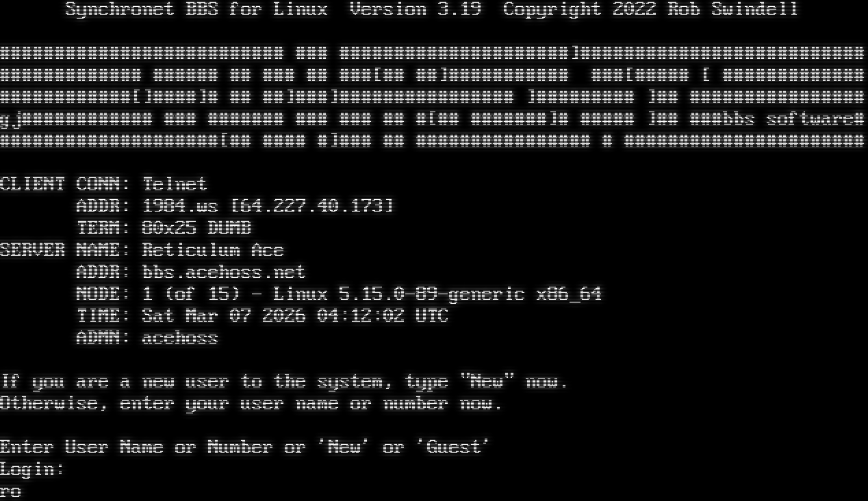 Synchronet BBS for Linux Version 3.19 Telnet connection from: 64.227.40.173 Resolving hostname... _ _ Synchronet BBS for Linux Version 3.19 Copyright 2022 Rob Swindell #​######################### ### #​####################]#​######################### #​############ #​##### ## ### ## ###[## ##]#​########## ###[#​#### [ #​############ #​###########[]#​###]# ## ##]###]#​############### ]#​######## ]## #​############### gj#​########### ### #​###### ### ### ## #[## #​######]# #​#### ]## ###bbs software# #​###################[## #​### #]### ## #​############### # #​##################### CLIENT CONN: Telnet ADDR: 1984.ws [64.227.40.173] TERM: 80x25 DUMB SERVER NAME: Reticulum Ace ADDR: bbs.acehoss.net NODE: 1 (of 15) - Linux 5.15.0-89-generic x86_64 TIME: Sat Mar 07 2026 04:12:02 UTC ADMN: acehoss If you are a new user to the system, type "New" now. Otherwise, enter your user name or number now. Enter User Name or Number or 'New' or 'Guest' Login: ro