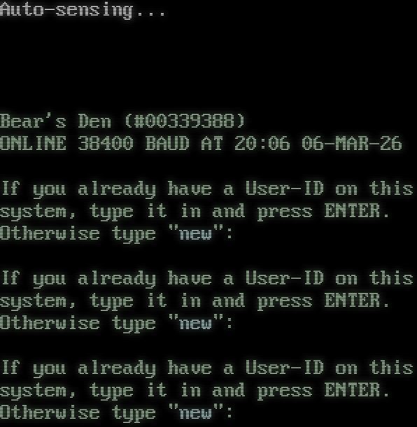 Auto-sensing... !  WELCOME! Bear's Den (#00339388) ONLINE 38400 BAUD AT 20:06 06-MAR-26 If you already have a User-ID on this system, type it in and press ENTER. Otherwise type "new": If you already have a User-ID on this system, type it in and press ENTER. Otherwise type "new": If you already have a User-ID on this system, type it in and press ENTER. Otherwise type "new":