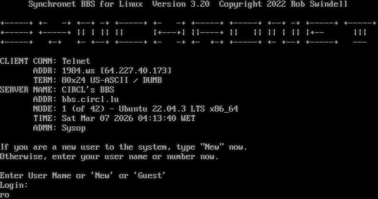 Synchronet BBS for Linux Version 3.20 Telnet connection from: 64.227.40.173 Resolving hostname... _ _ Synchronet BBS for Linux Version 3.20 Copyright 2022 Rob Swindell +​-----+ +- -+ +​--+ -+ +​-----+ +- -+ +​-----+ +​-----+ +​--+ -+ +​-----+ +​-----+ +​-----+ +​-----+ \|\| \| \|\| \|\| \|+​---+\| \|\|-​---+ \|\| \|\| \|\| \| \|\| \|+-- \|\|\| +​-----+ +-+ +- +​--+ +​-----+ +- -+ +- +-+ +​-----+ +- +​--+ +​-----+ --- CLIENT CONN: Telnet ADDR: 1984.ws [64.227.40.173] TERM: 80x24 US-ASCII / DUMB SERVER NAME: CIRCL's BBS ADDR: bbs.circl.lu NODE: 1 (of 42) - Ubuntu 22.04.3 LTS x86_64 TIME: Sat Mar 07 2026 04:13:40 WET ADMN: Sysop If you are a new user to the system, type "New" now. Otherwise, enter your user name or number now. NN: Enter User Name or 'New' or 'Guest' Login: ro