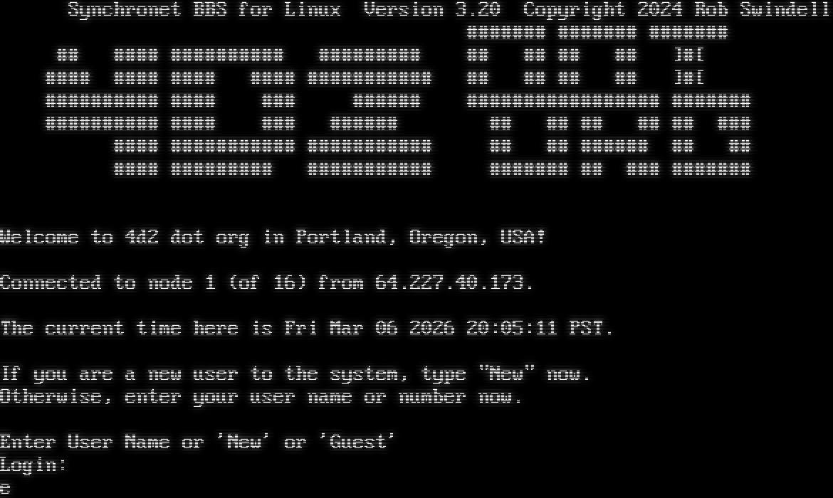 Synchronet BBS for Linux Version 3.20 Telnet connection from: 64.227.40.173 Resolving hostname... _ _ Synchronet BBS for Linux Version 3.20 Copyright 2024 Rob Swindell #​###### #​###### #​###### ## #​### #​######### #​######## ## ## ## ## ]#[ #​### #​### #​### #​### #​########## ## ## ## ## ]#[ #​######### #​### ### #​##### #​################ #​###### #​######### #​### ### #​##### ## ## ## ## ## ### #​### #​########## #​########## ## ## #​##### ## ## #​### #​######## #​########## #​###### ## ### #​###### Welcome to 4d2 dot org in Portland, Oregon, USA! Connected to node 1 (of 16) from 64.227.40.173. The current time here is Fri Mar 06 2026 20:05:11 PST. If you are a new user to the system, type "New" now. Otherwise, enter your user name or number now. NN: Enter User Name or 'New' or 'Guest' Login: Bee