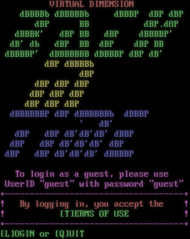 ∩┐╜∩┐╜∩┐╜∩┐╜ _​_______________________________ [PLEASE USE ANSI MODE COMPATIBLE ] [ TERMINALS ] [ TESTED WITH: ] [ DCTELNET(AMIGA) ] [ NOVATERM(C64) ] [ KIPPERTERM(C128) ] [ ICYTERM(PC) ] [ SyncTERM(PC/Mac) ] [ CONNECTBOT(ANDROID) ] [ JUICESSH(ANDROID) ] [ (OTHERS MIGHT NOT WORK AS ] [ EXPECTED) ] [ Please set DEL button to ] [ BACKSPACE ] '''''''''''''''''''''''''''''''' VIRTUAL DIMENSION dBBBBb dBBBBBb dBBBP dBP dBP dBP BB dBP.d8P dBBBK' dBP BB dBP dBBBBP' dB' db dBP BB dBP dBP BB dBBBBP' dBBBBBBB dBBBBP dBP dB' dBP dBBBBb dBP dBP dBP dBP dBP dBP dBP dBP dBP dBP dBBBBBBP dBP dBBBBBBb dBBBP ' dB' dBP dBP dB'dB'dB' dBBP dBP dBP dB'dB'dB' dBP dBP dBP dB'dB'dB' dBBBBP To login as a guest, please use UserID "guest" with password "guest" +​------------------------------------+ ! By logging in, you accept the ! ! [T]ERMS OF USE ! +​------------------------------------+ [L]OGIN or [Q]UIT