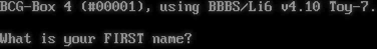 0! BCG-Box 4 (#00001), using BBBS/Li6 v4.10 Toy-7. \*\*EMSI_IRQ8E08 \*\*EMSI_REQA77E What is your FIRST name?