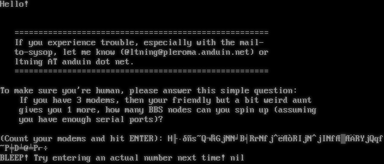 Hello! =​==================================================== If you experience trouble, especially with the mail- to-sysop, let me know (@ltning@pleroma.anduin.net) or ltning AT anduin dot net. =​==================================================== To make sure you're human, please answer this simple question: If you have 3 modems, then your friendly but a bit weird aunt gives you 1 more, how many BBS nodes can you spin up (assuming you have enough serial ports)? (Count your modems and hit ENTER): H╟·δñs~Q¬₧GjNN╛B╡RrNfj^ëÆòRIjN^jINfÆ▒ÆÄRYjQqf~ P╪D╧@╧P⌐÷ BLEEP! Try entering an actual number next time! nil
