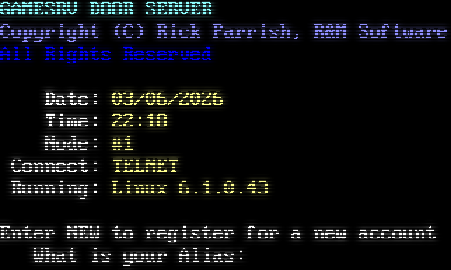GAMESRV DOOR SERVER Copyright (C) Rick Parrish, R&M Software All Rights Reserved Date: 03/06/2026 Time: 22:18 Node: #1 Connect: TELNET Running: Linux 6.1.0.43 Enter NEW to register for a new account What is your Alias: