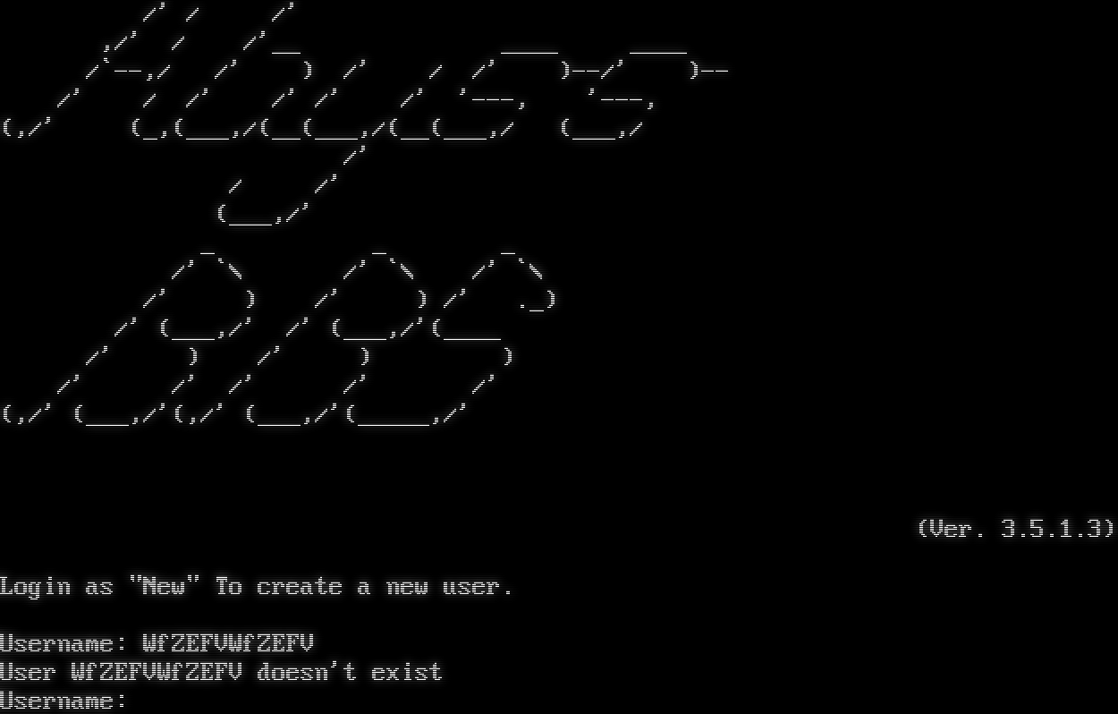 Welcome to The , /'/ /' /' / /' ,/' / /'__ _​___ _​___ /\`--,/ /' ) /' / /' )--/' )-- /' / /' /' /' /' '---, '---, (,/' (_,(___,/(__(___,/(__(___,/ (___,/ /' / /' (___,/' _ _ _ /' \`\\ /' \`\\ /' \`\\ /' ) /' ) /' ._) /' (___,/' /' (___,/'(_​___ /' ) /' ) ) /' /' /' /' /' (,/' (___,/'(,/' (___,/'(_​____,/' (Ver. 3.5.1.3) Login as "New" To create a new user. Username: WfZEFVWfZEFV User WfZEFVWfZEFV doesn't exist Username:
